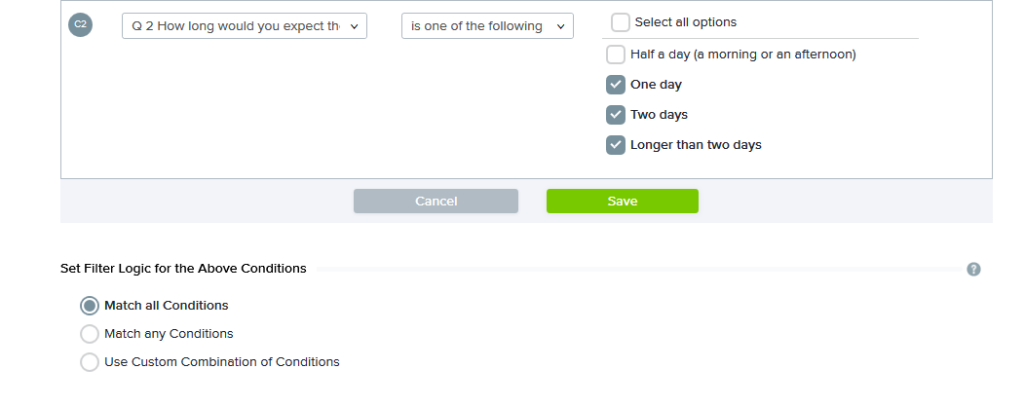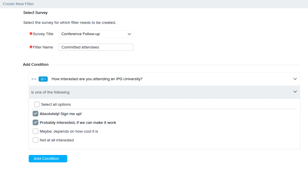 Choose the filter question, and then the answers that matter. In this example, I aim to look at the conference planning data for people who are serious about attending the event (absolutely or probably will attend), because I want to choose a destination most convenient to committed members. So I choose the “absolutely” and “probably” answers.
