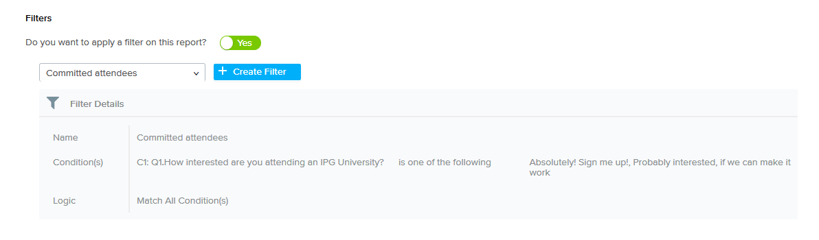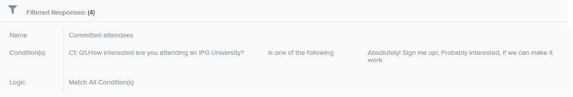 Pay attention to the AND, OR, and NOT criteria. In this case, the “will you attend?” question permits only a single answer. In other instances, the filter question may support multiple responses (“Which of these cities would be acceptable?”), and the AND versus OR results affects the data selection.