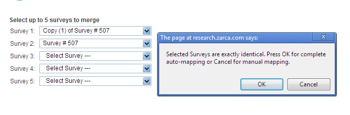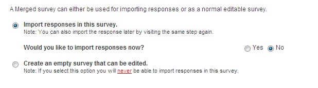 - You may only merge surveys that are in active states; i.e., each survey must contain at least one completed response.