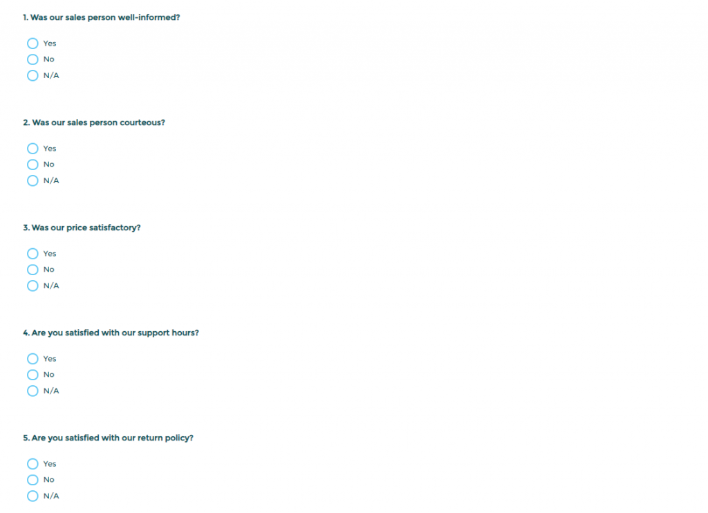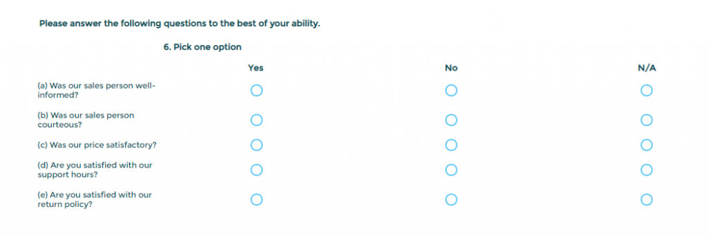 Compare the above survey with the one below. It’s the same survey but uses a Matrix Grid question type to reduce the length of the survey. It makes for quick participation and drives up the response rate.