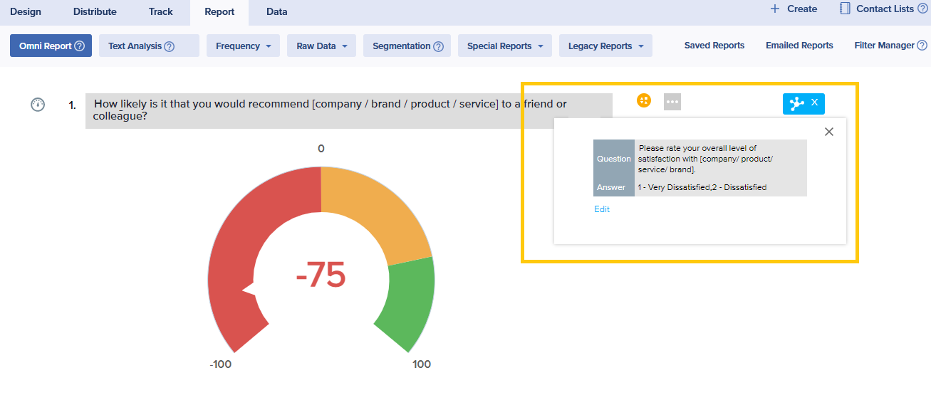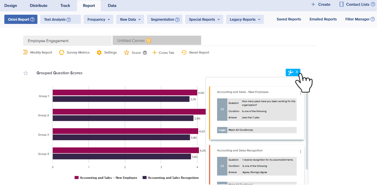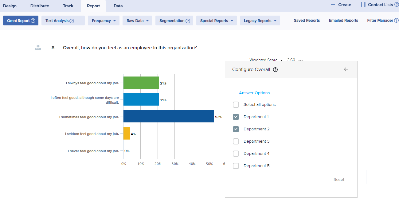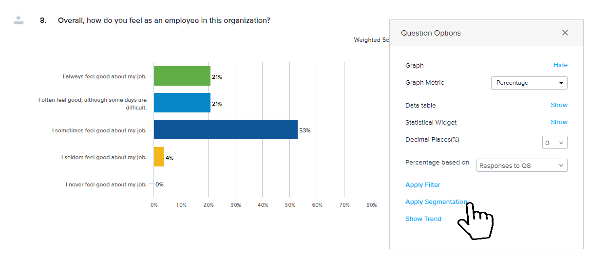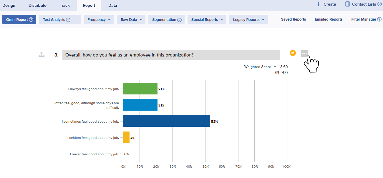- In the Omni Report, hover over a question, you’d like to segment. For example, “How satisfied are you working for us?”