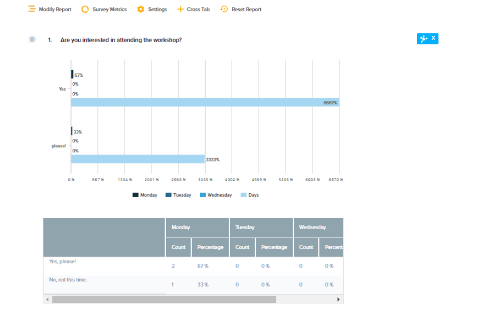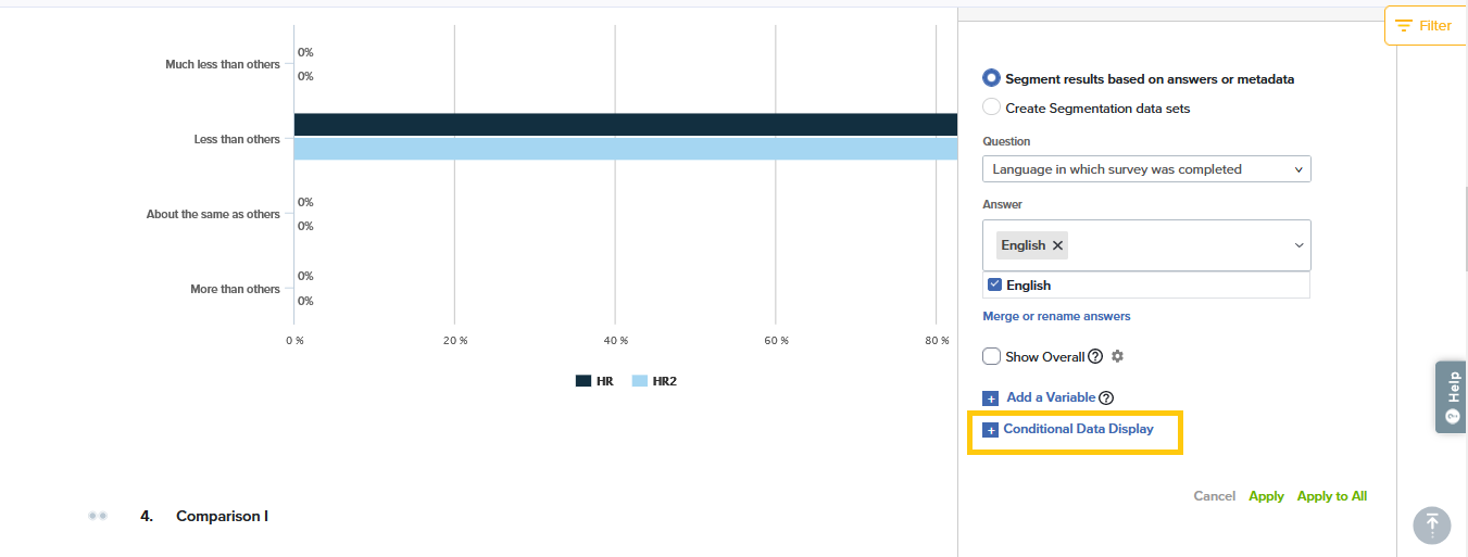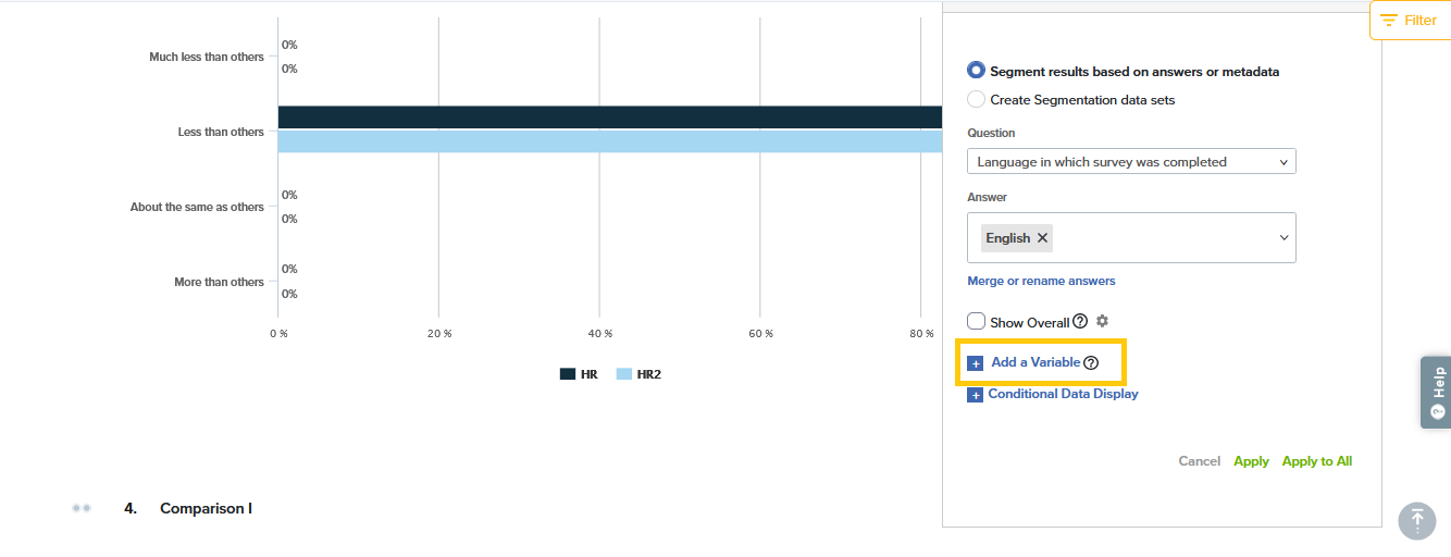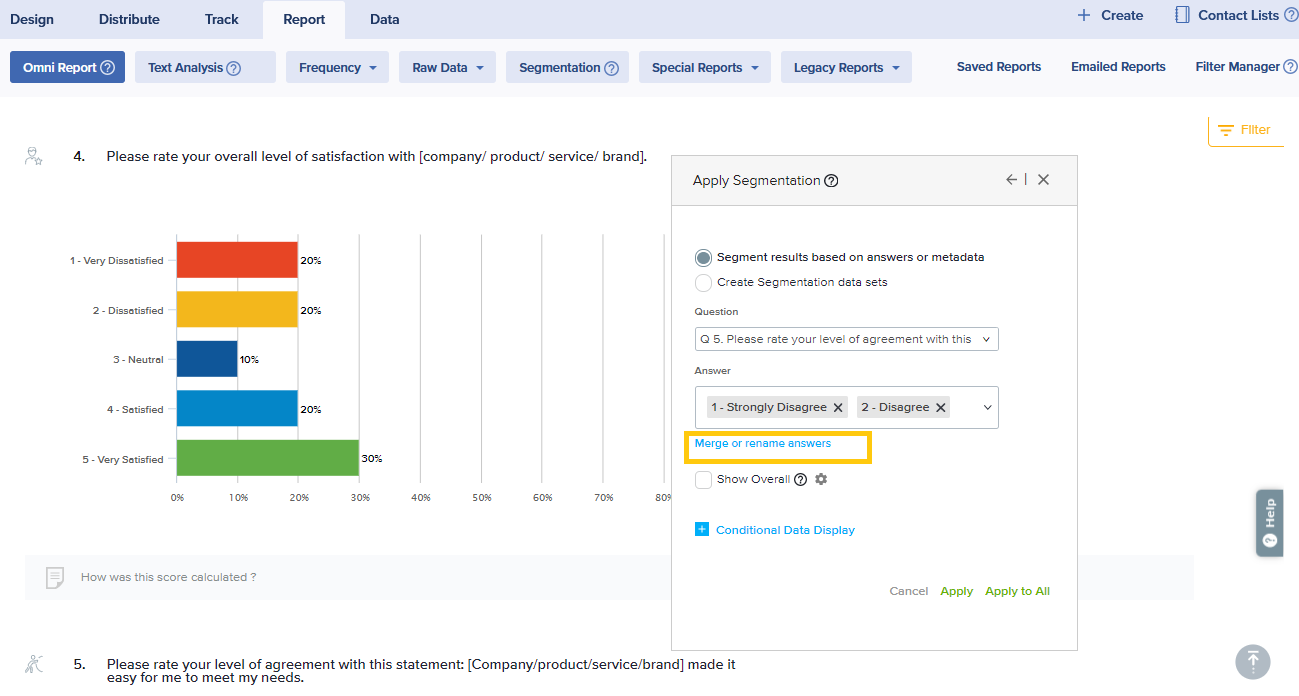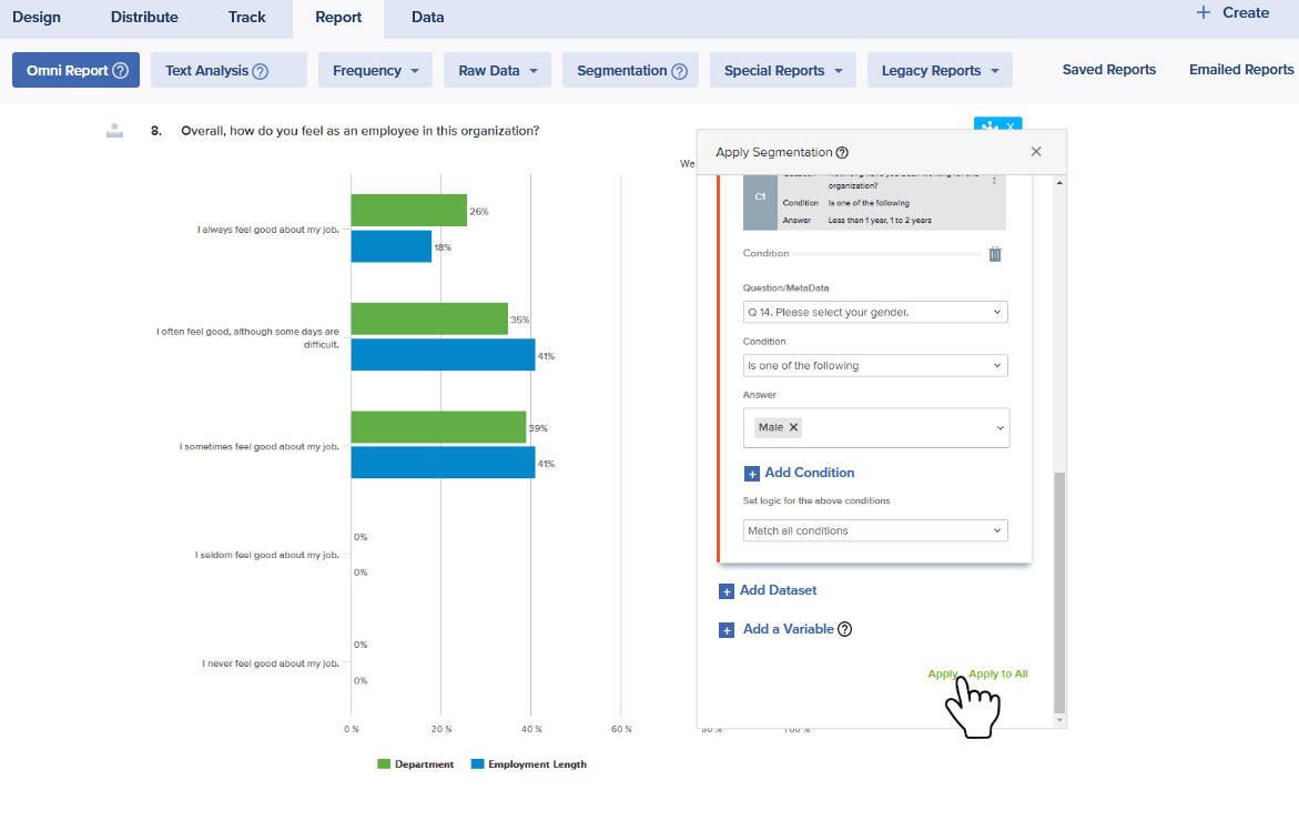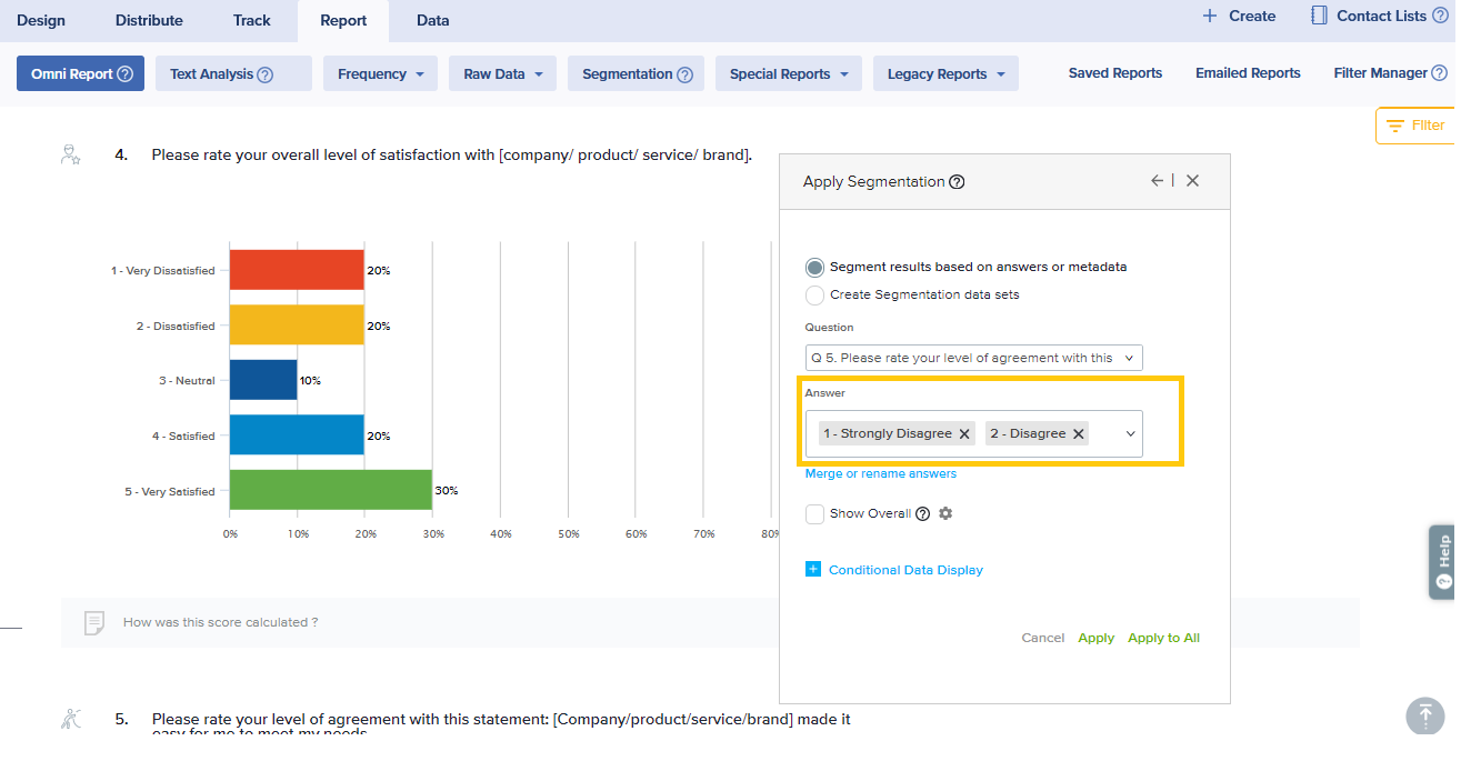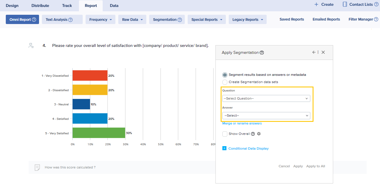 To drill down to a deeper understanding of your results, you may segment results based on specific answers, metadata elements, or data sets of your choice. Segmentation can be applied to one, some, or all questions in your report.