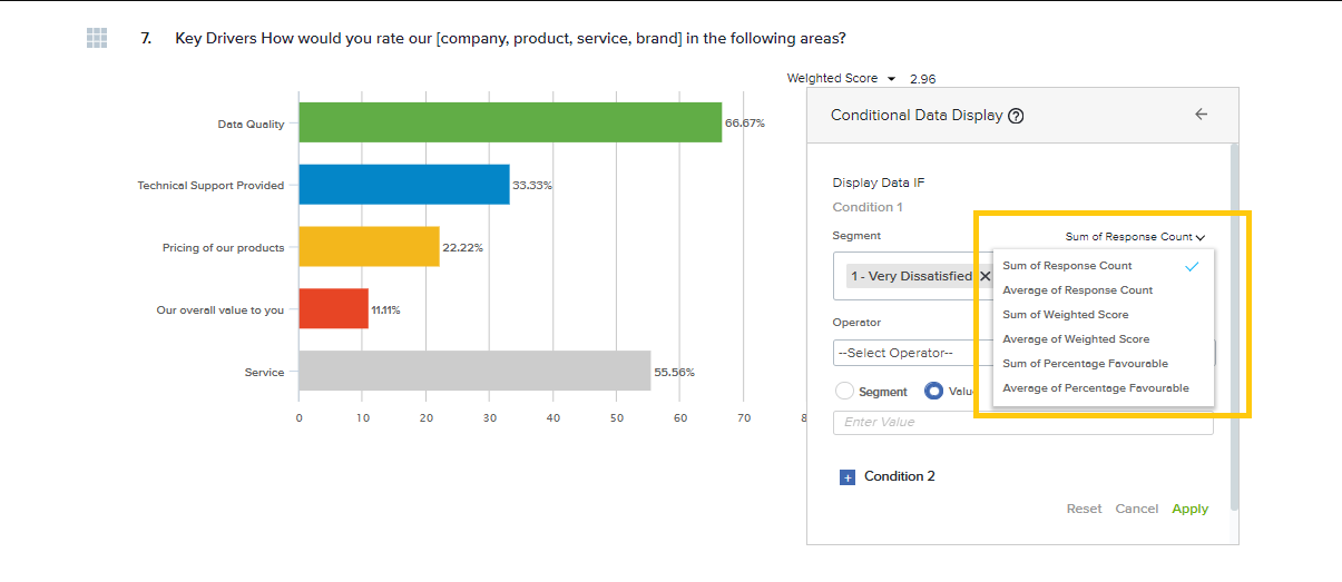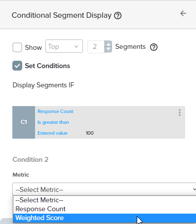 When a single value like Weighted Score, Net Intent, or Percent Favorable is segmented, you may choose to show only certain segments based on the conditions of your choice. This can be helpful if you have lots of results but only want to highlight certain segments.
