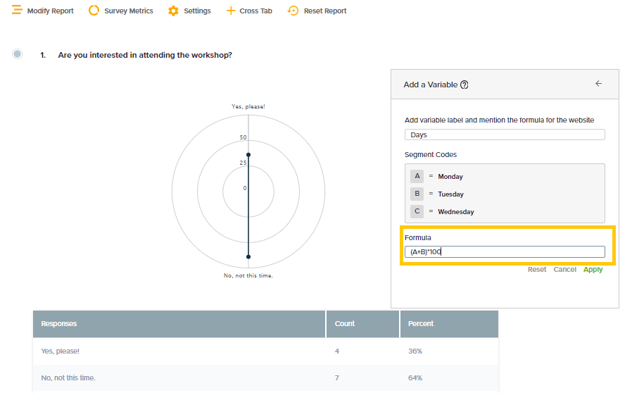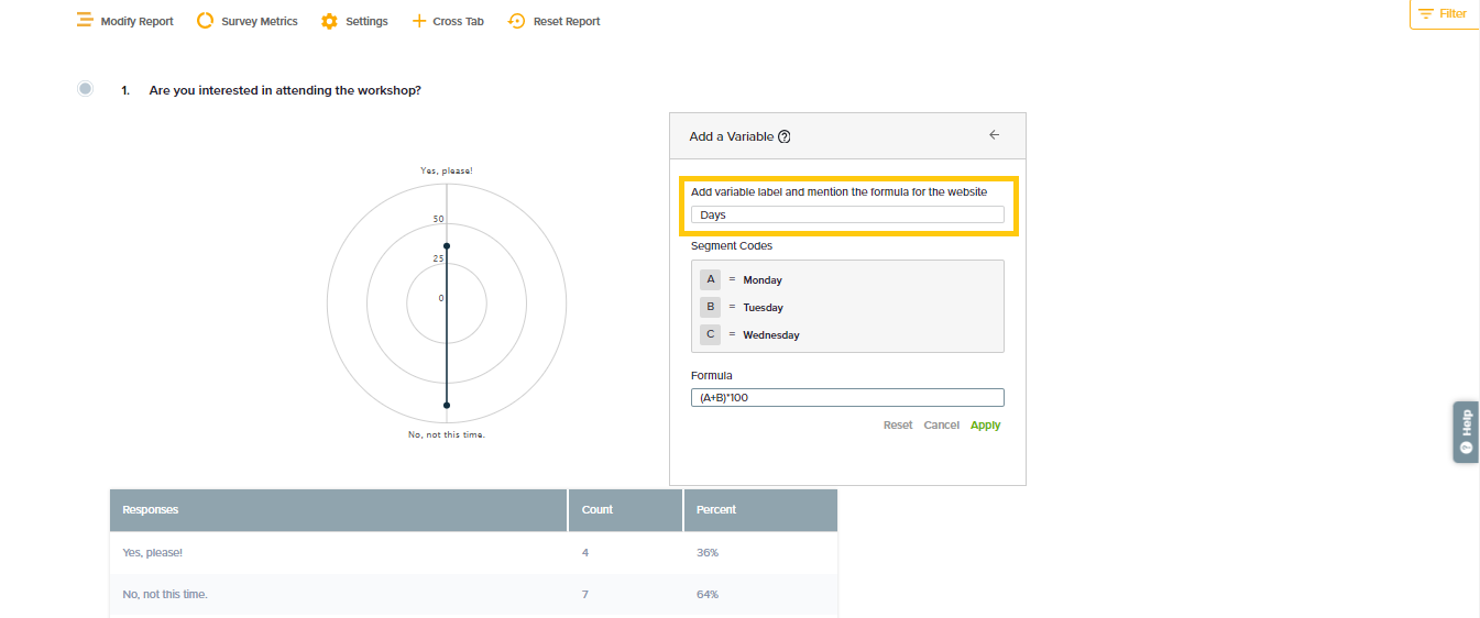 - Click Apply to save. Then, review charts and tables to see the Variable in addition to all the selected segments.
