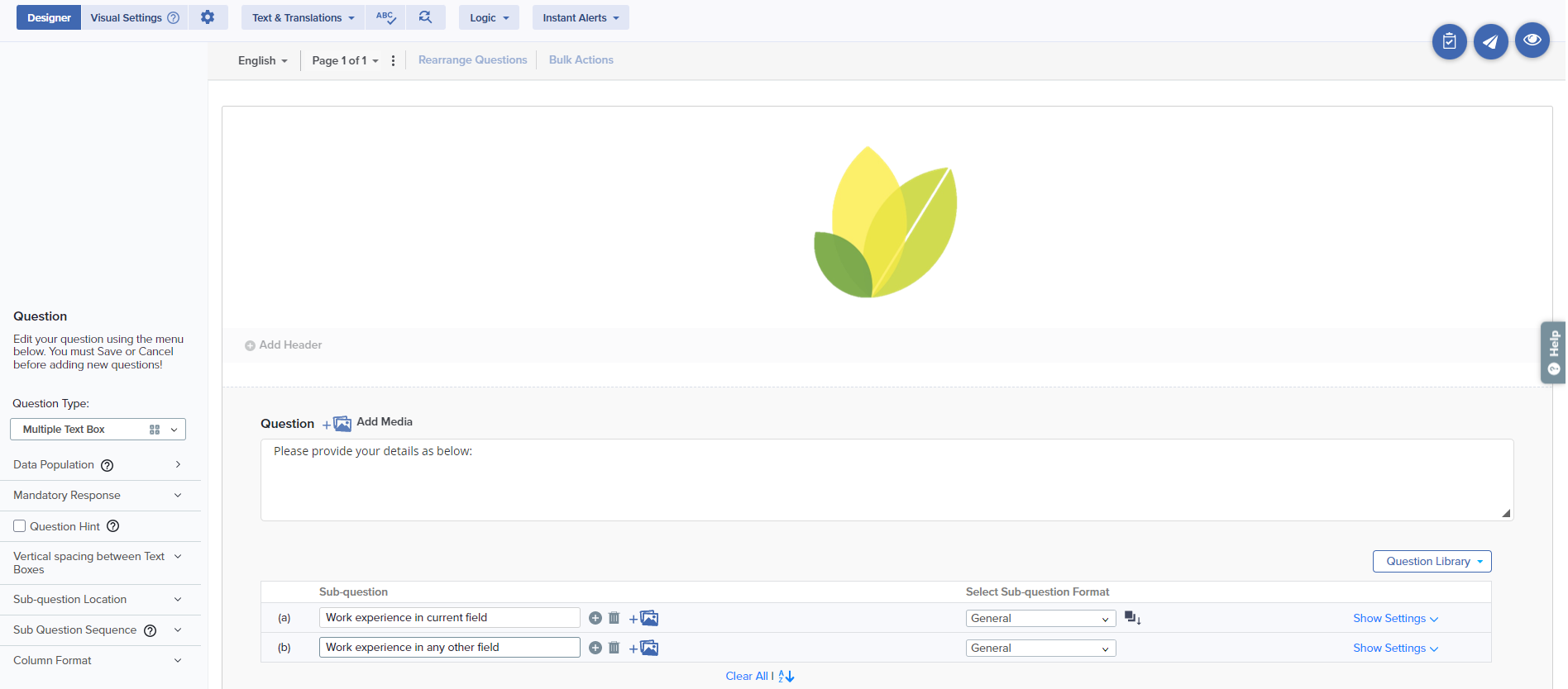 - You may also choose to drag and drop a Multiple Text Box question to ask any questions that require to participant to include multiple fields of details.