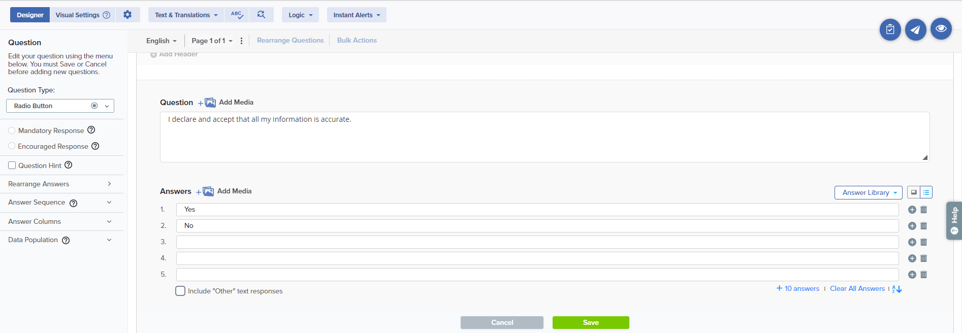 - A Radio Button question is a good choice for a final confirmation/declaration statement.