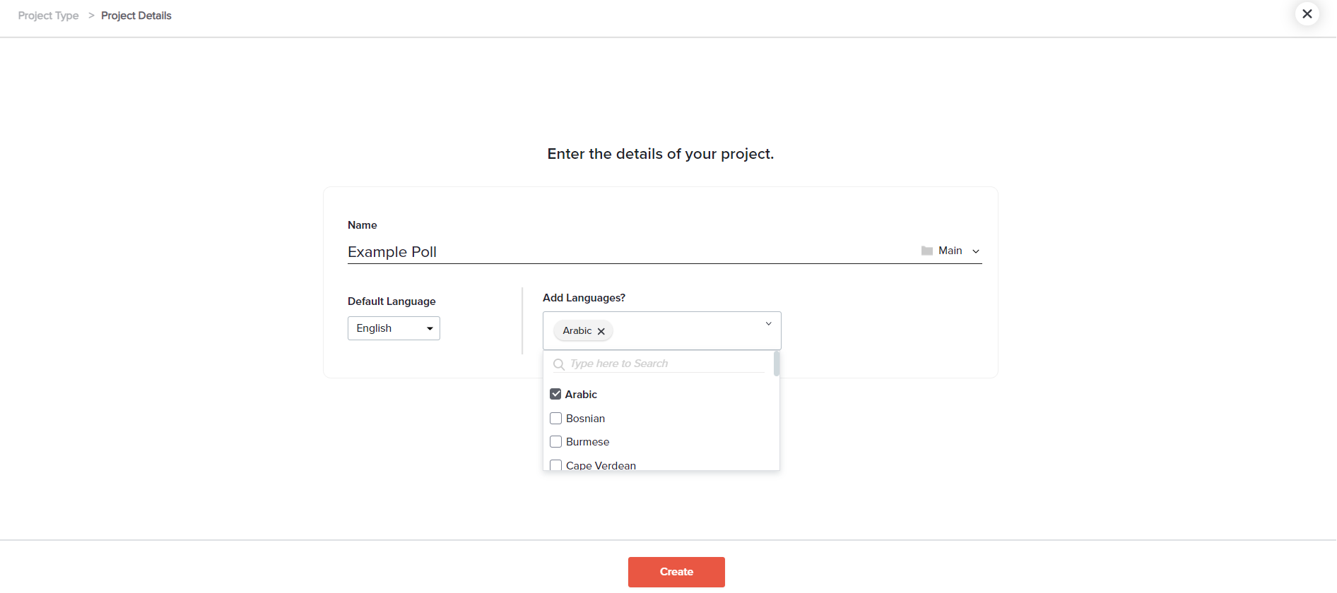 - Default Language: Choose the language in which your poll will be created. Primary language cannot be changed after poll creation.