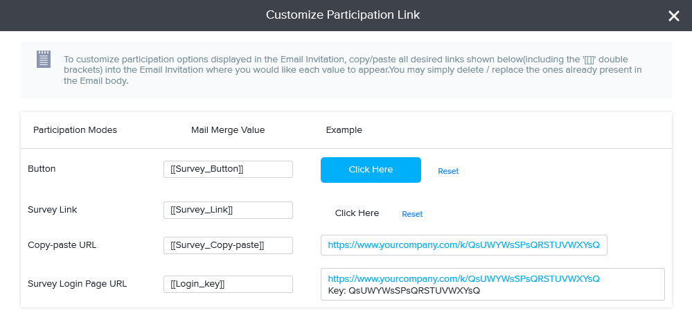 - Survey Login Page URL: Copy/Paste the Mail Merge value ‘[[Login_key]]’ to include a participation link with a key in the format displayed in the example.