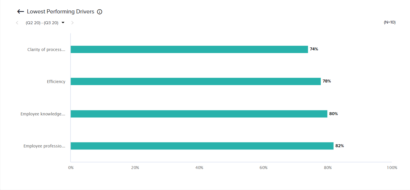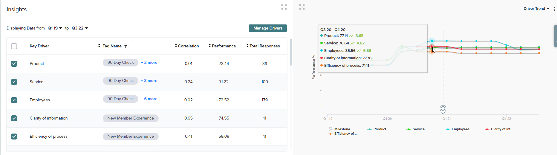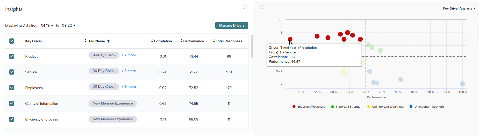 For a deeper understanding of what’s impacting the performance of your CX metrics across Tags, view the Insights section and drill down on important Drivers. Understand what matters the most to your customers and what should be your top priority.