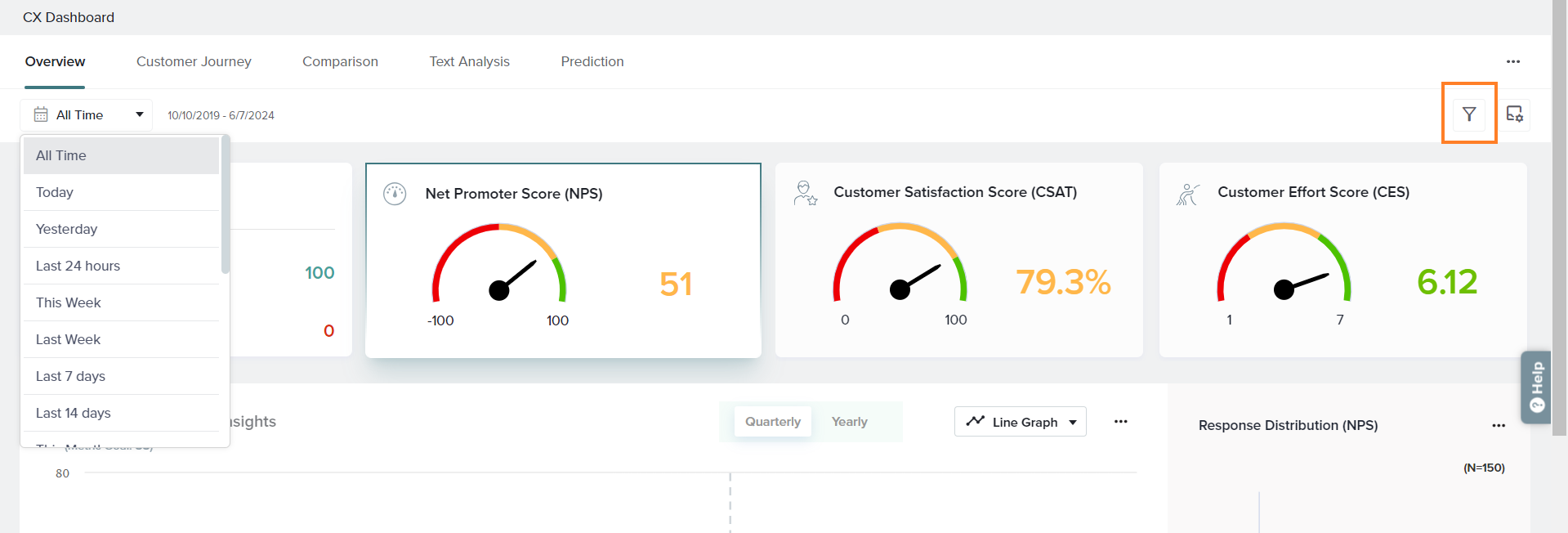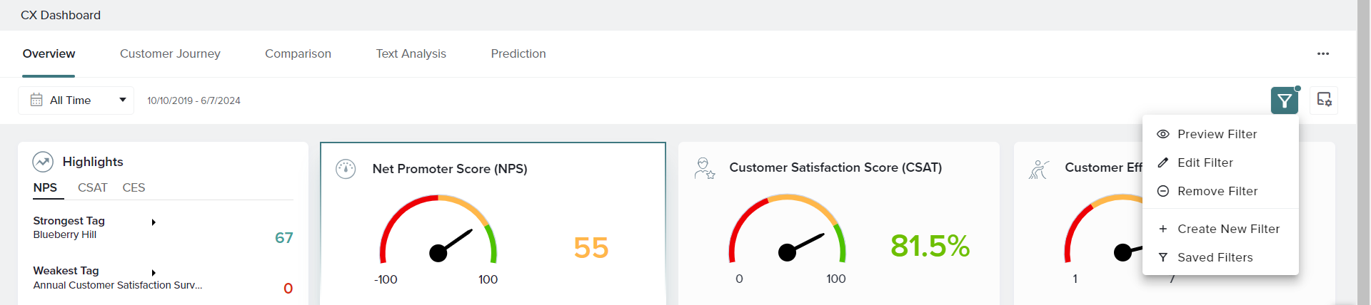 By default, the Overview section will show data received from all CX metric questions with Tags applied. To modify the display, you may choose to Manage Time, Manage Metrics, apply Filters, and review Dashboard Settings as needed.
