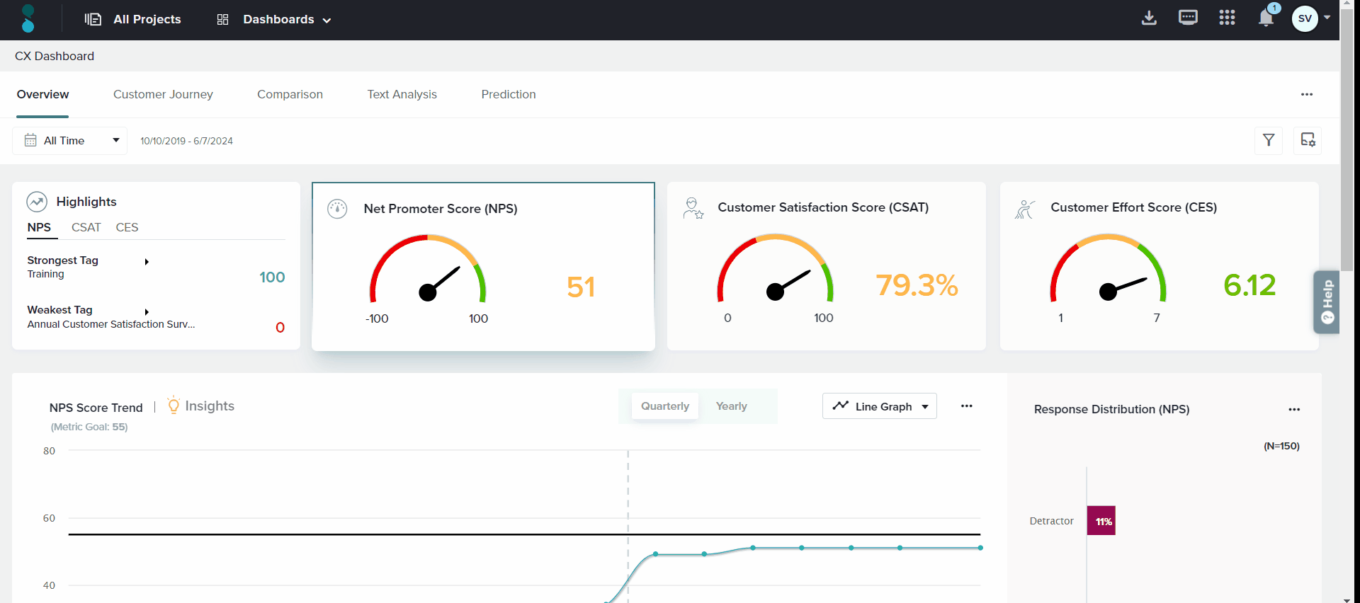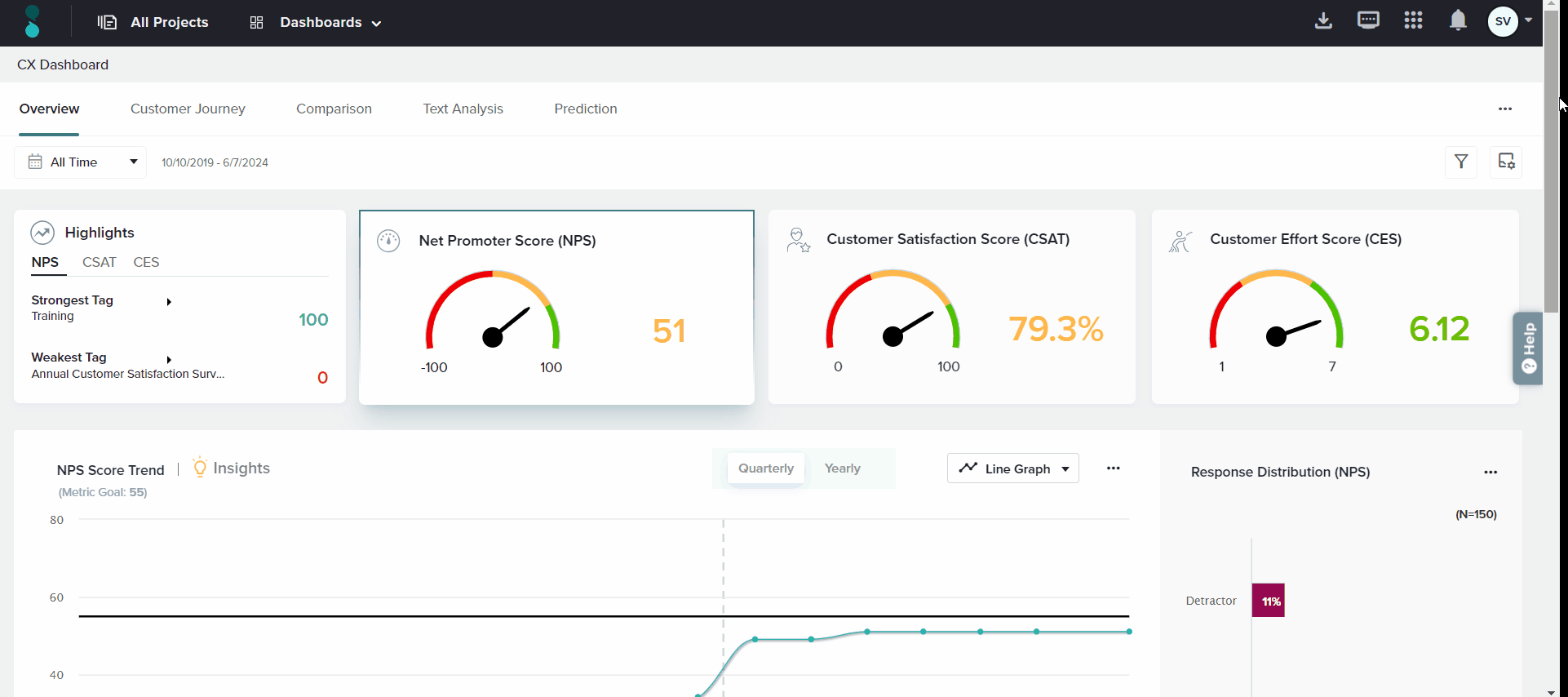 Within the Overview section of the CX Dashboard, you’ll see trend graphs and response distribution for your key selected CX metrics, strong and weak Tags, and insights on Key Drivers impacting your metrics.
