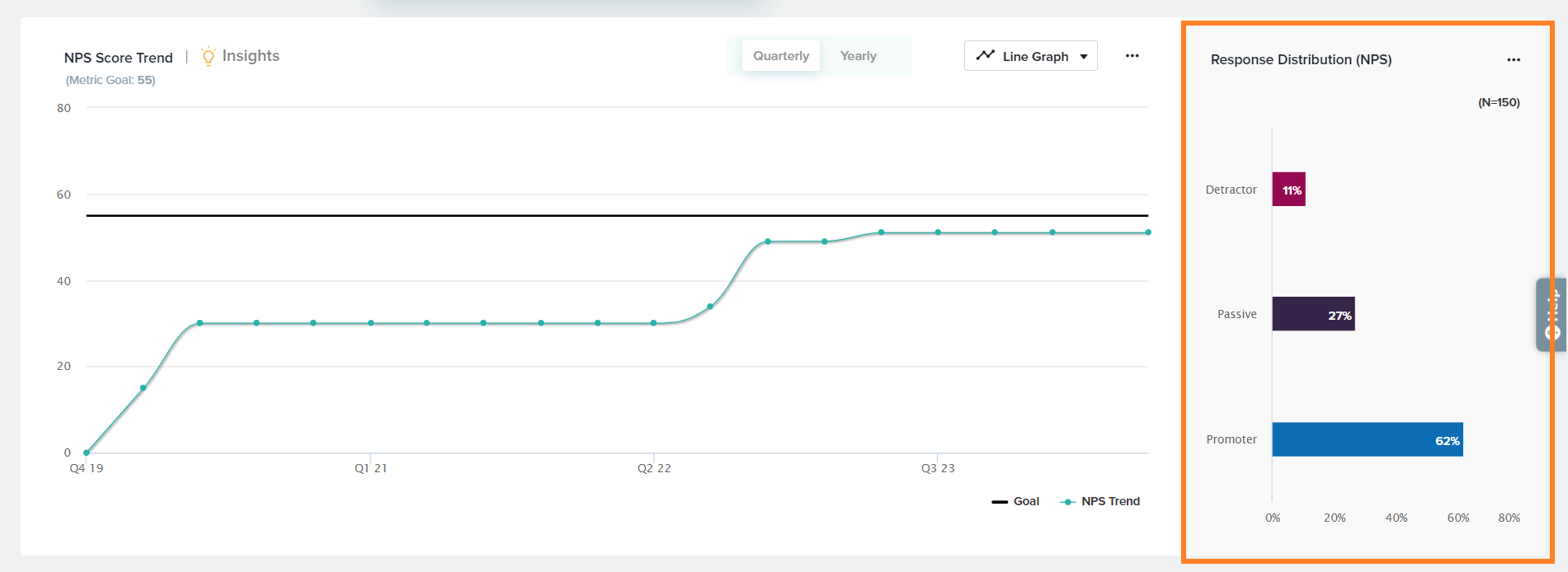 For example, clicking on Net Promoter Score (NPS) will update the data below, including the Score Trend, Response Distribution, and Key Driver Insights – all based on NPS.