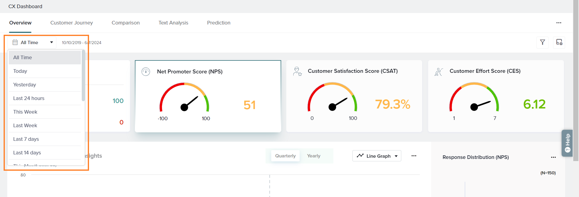 The CX Dashboard Overview makes it easy to track your core business metrics. Choose to display Net Promoter Score (NPS), Customer Satisfaction Score (CSAT), Customer Effort Score (CES), and any Custom Metrics you have created.