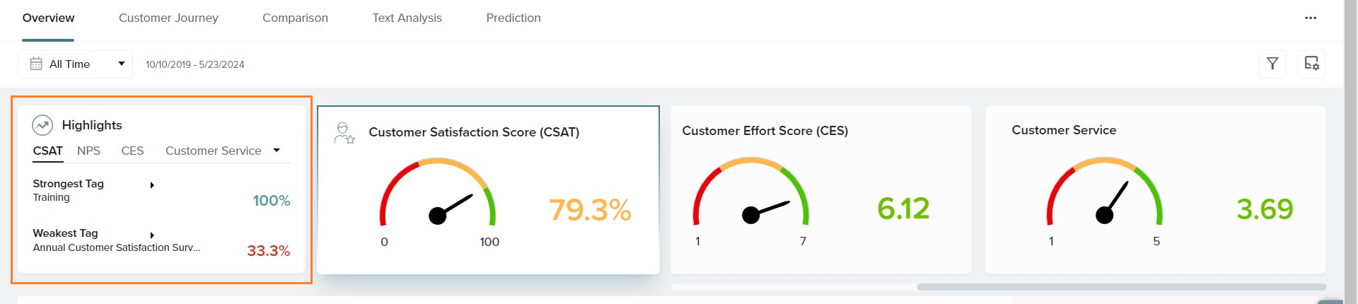 This section provides a real-time look at the strongest and weakest Tags for each of your core CX metrics, either overall or from selected Categories. Learn more about Highlights.