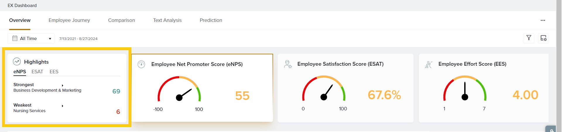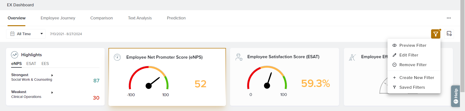 The EX Dashboard Overview makes it easy to track your core business metrics. Choose to display Net Promoter Score (eNPS), Employee Satisfaction Score (ESAT), Employee Effort Score (EES), and any Custom Metrics you have created.