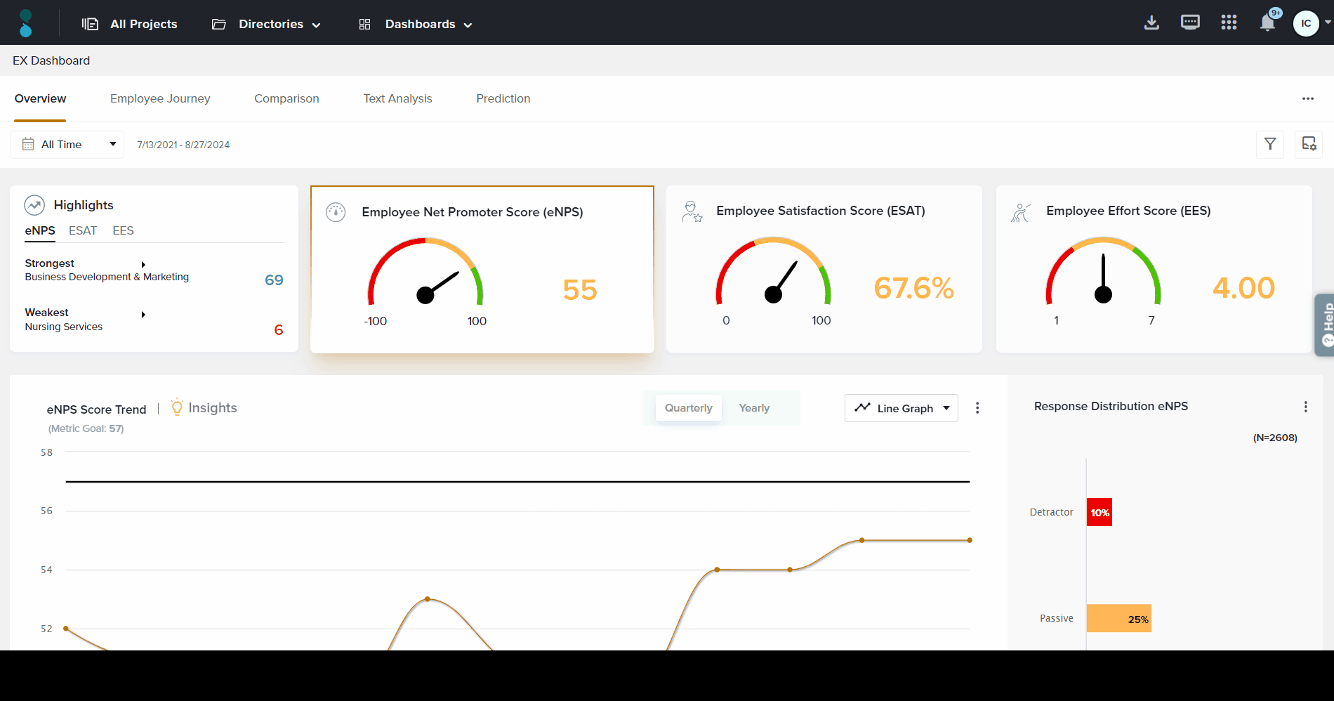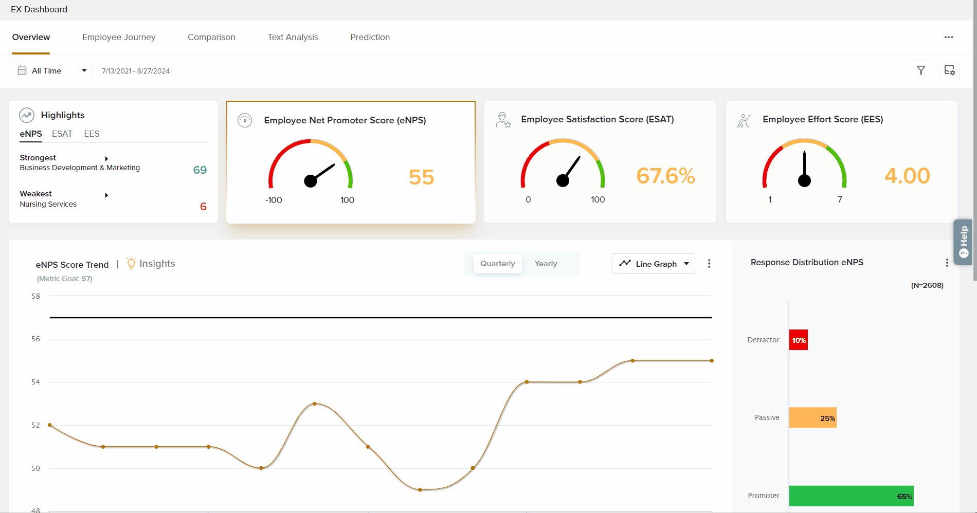 This section displays trends in your most important EX metrics, as selected under Manage Metrics. Click on the relevant score card on the top of the Overview to review data from each metric separately.