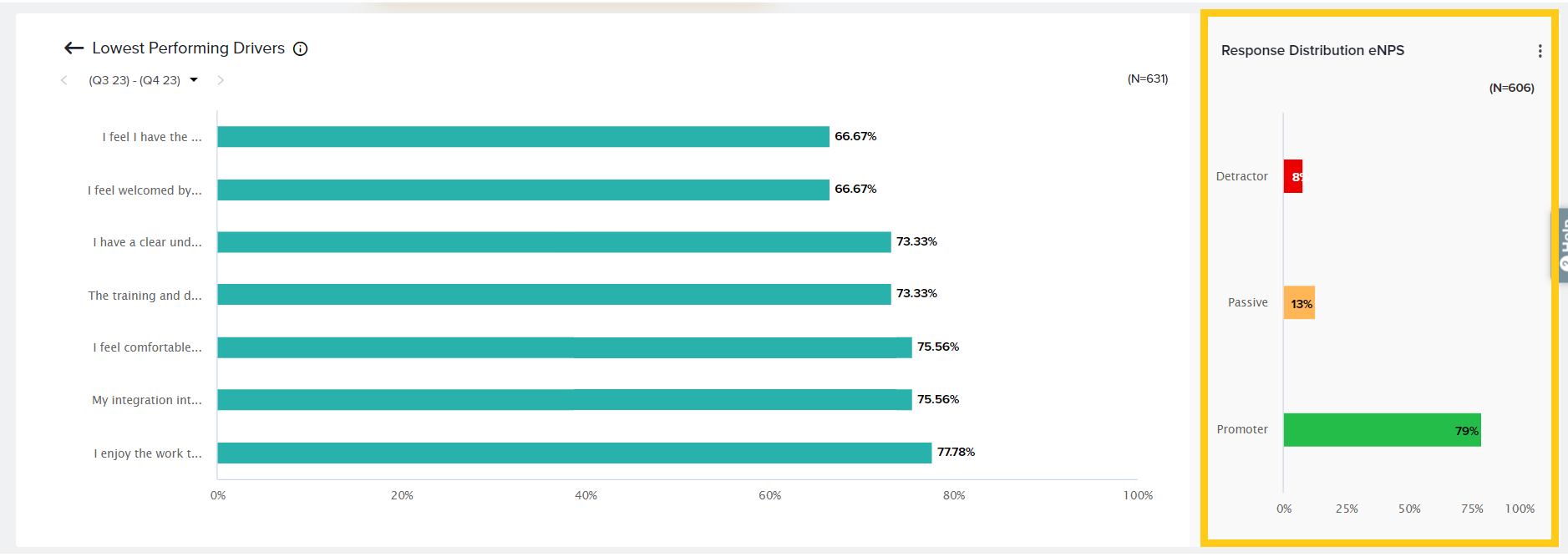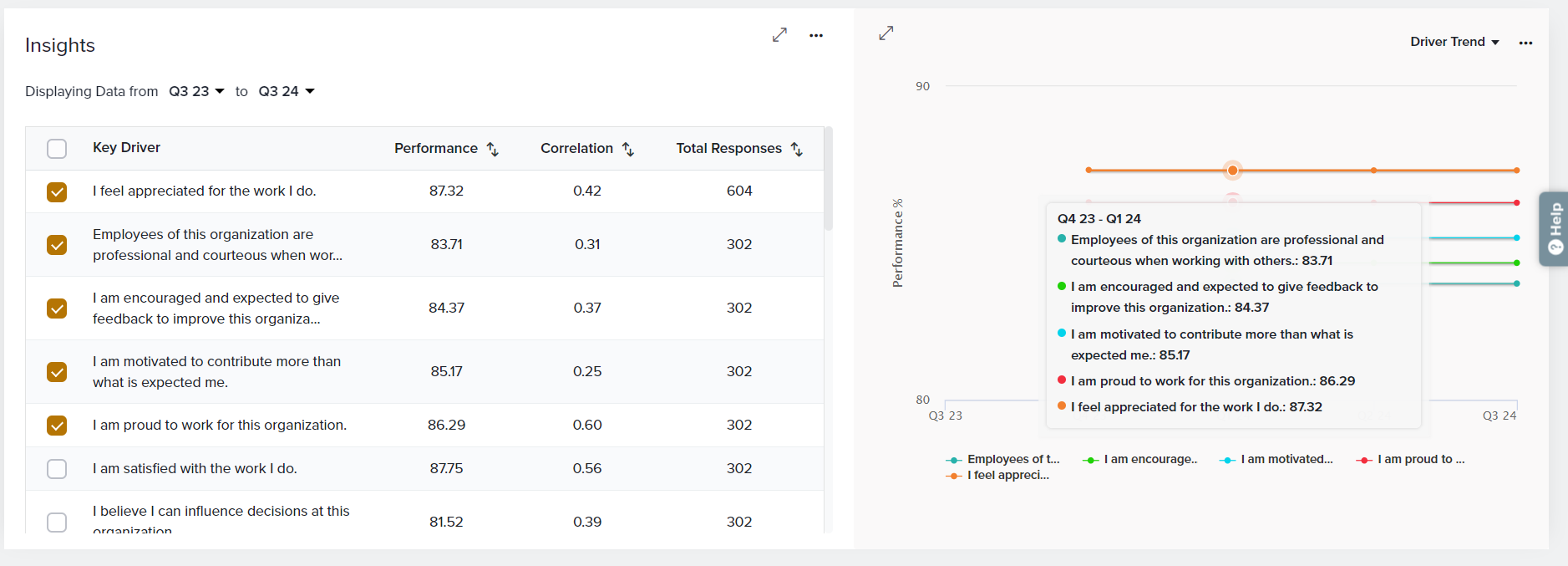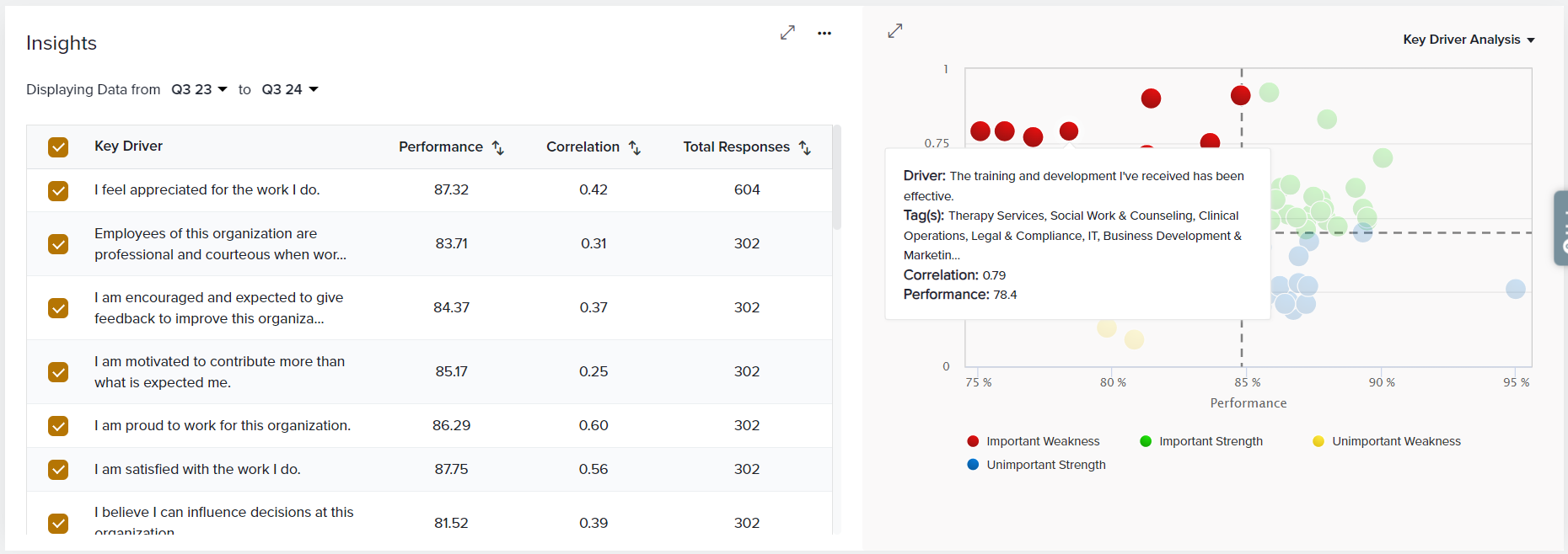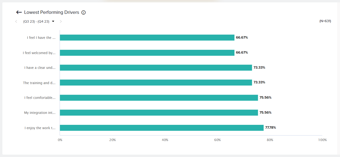 For a deeper understanding of what’s impacting the performance of your EX metrics across Tags, view the Insights section and drill down on important Drivers. Understand what matters the most to your employees and what should be your top priority.