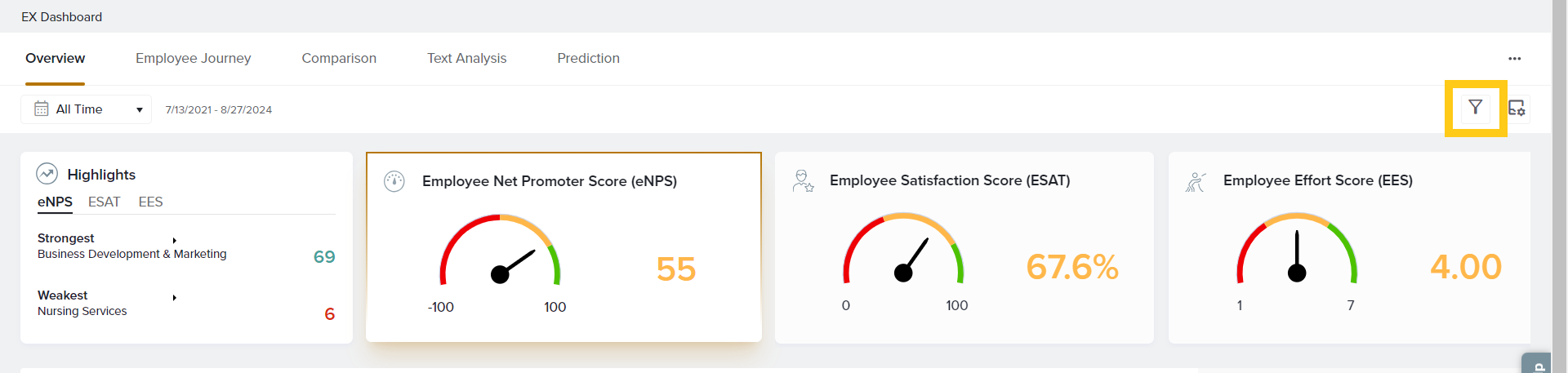 This section provides a real-time look at the strongest and weakest Tags for each of your core EX metrics, either overall or from selected Categories. Learn more about Highlights.