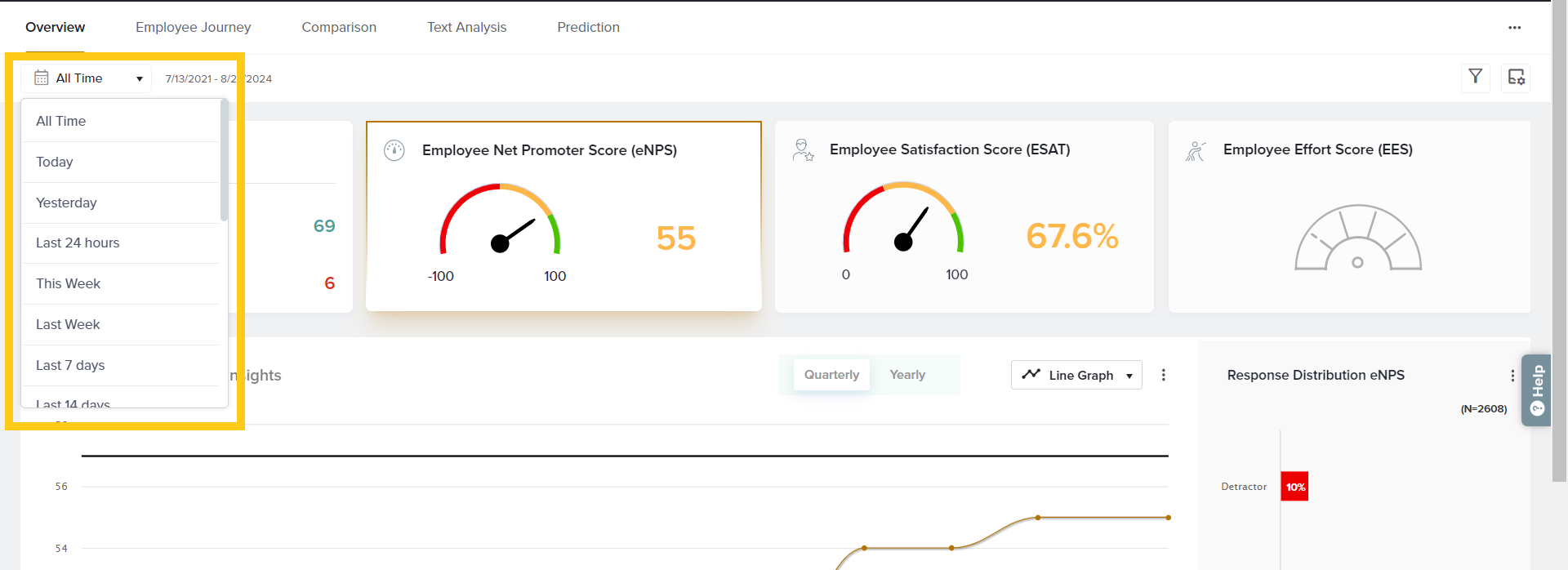 For example, clicking on Net Promoter Score (eNPS) will update the data below, including the Score Trend, Response Distribution, and Key Driver Insights – all based on eNPS.