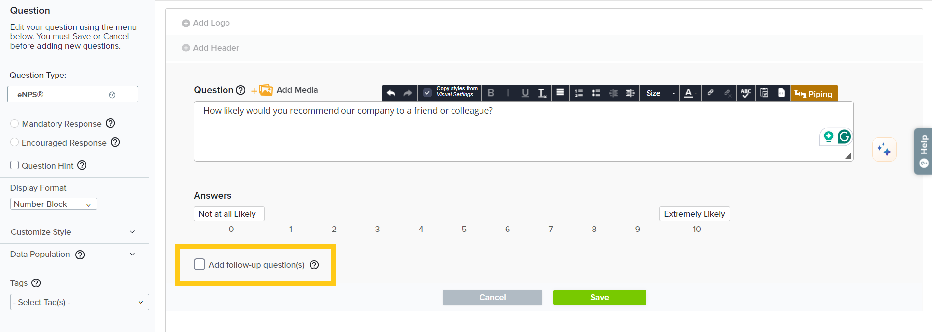 - While in edit mode, check ‘Add follow-up question(s)’ and Save.