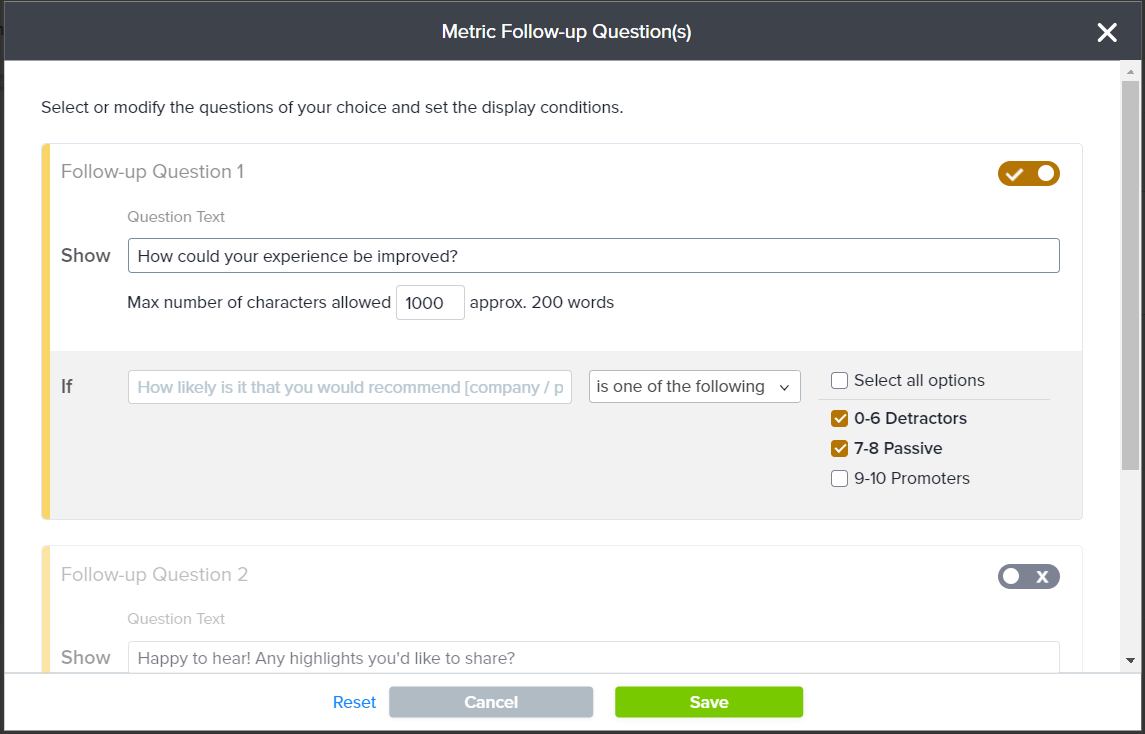 - Next, on the pop-up, customize your follow-up question(s), including both the text and the triggering conditions.