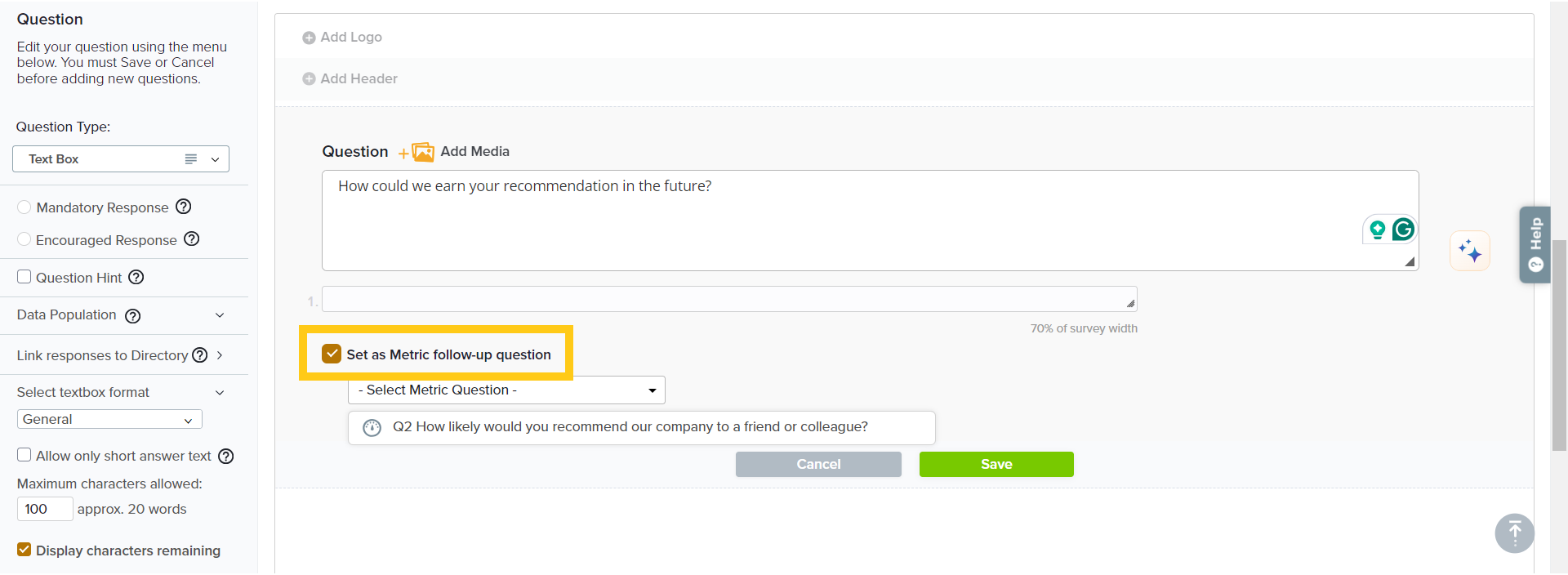 - Select the check box Set as Metric follow-up question. Choose the metric question and click Save.