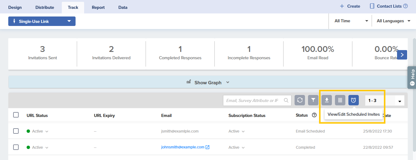 On the Distribute menu bar, click on Track. Choose the distribution method you used to schedule your invitations (Single-Use or Multi-Use Link) by clicking on the relevant option from the dropdown menu. Then, click on the View/Edit Scheduled Invites button to reschedule.