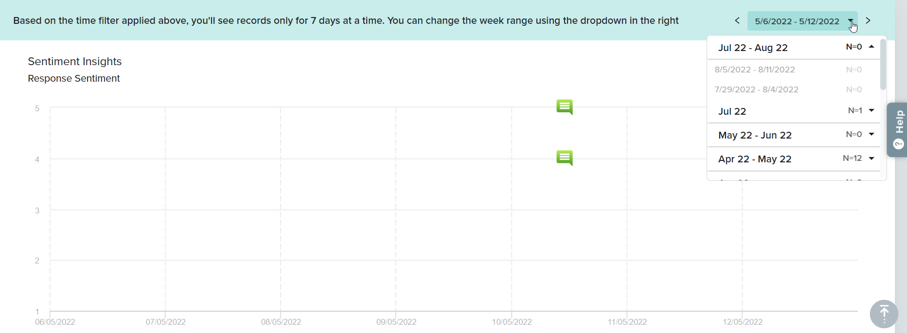 All your responses will be displayed in this graph with respect to metric rating and time period. The color of the speech bubble indicates the sentiment. You can click on the speech bubble to read the entire response in the table below. Your weekly sentiment score will be divided into 7 days. Switch between the 7-day slot by clicking on the dropdown menu on the right.