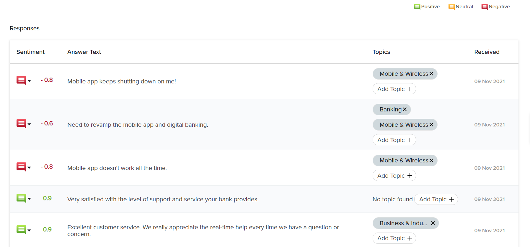 • Add more topics to each response by clicking on the Add Topic button.