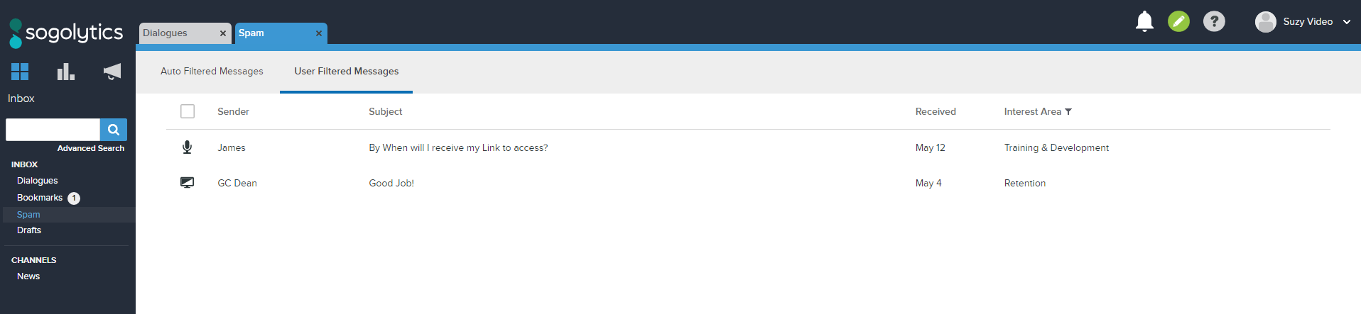 As great as our system is at determining what Dialogues are spam, nothing is ever perfect and sometimes messages slip through. Any user can mark Dialogues as spam, and when they do you’ll find those on the User-Filtered Messages tab.