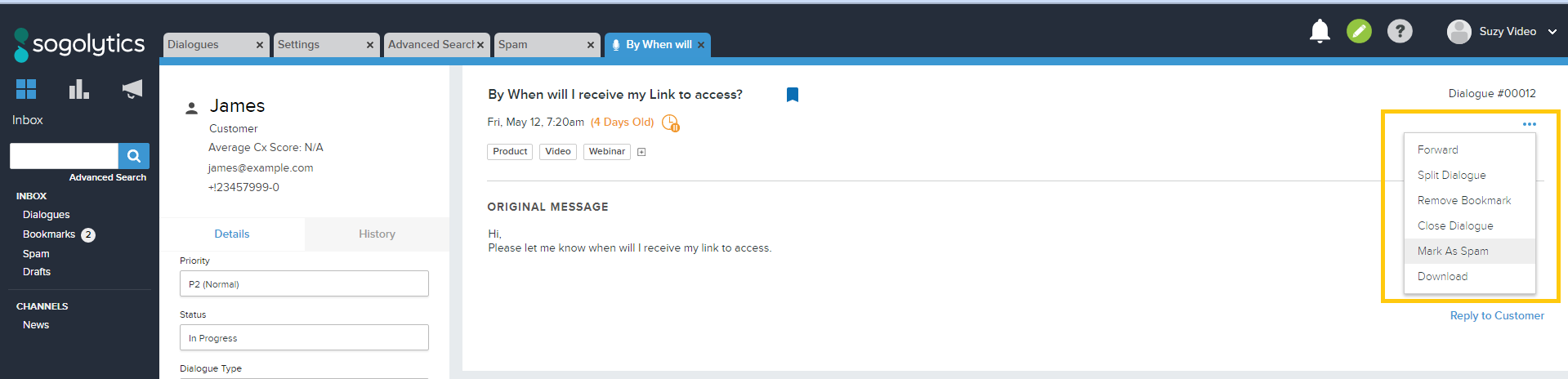 Once the message is marked as spam, it will no longer be in your Dialogue Inbox. If you wish to find the message, you’ll want to go to your Spam folder.