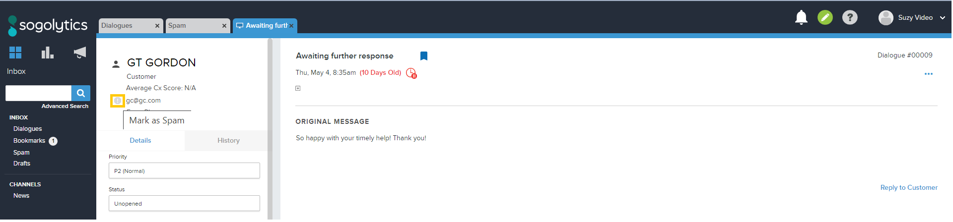 If you also wish to mark an email address as spam, you can easily do so. Open that specific Dialogue and hover over the customer’s email. You’ll see a greyed-out octagon at the right in that text box, and if you click on that icon a pop-up will appear. It will ask you to confirm that you want to block all future Dialogues from this email, and it also gives you the option to mark all previous Dialogues from this email as spam. Then hit “Block Sender” to confirm this request.