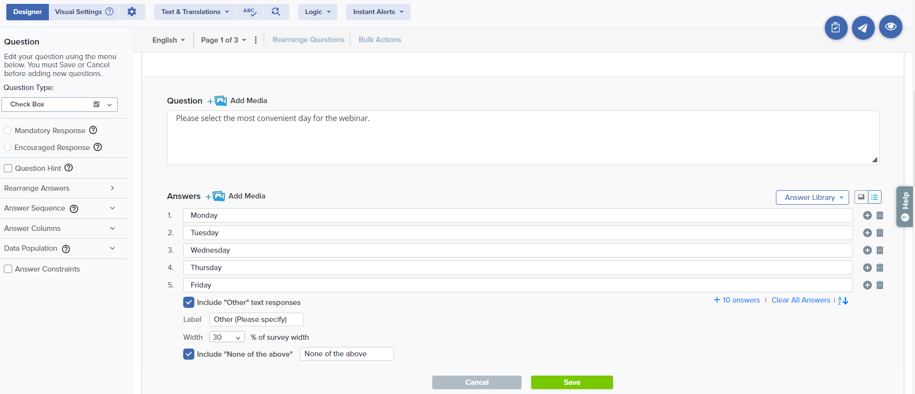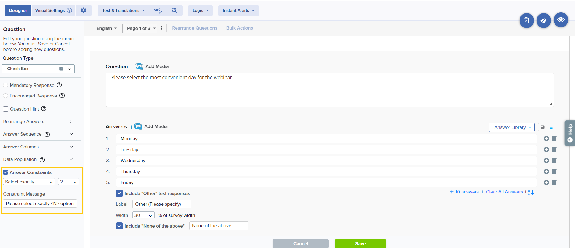 To improve data quality, you may add Answer Constraints to control the exact, minimum, or maximum number of answers a participant may select.