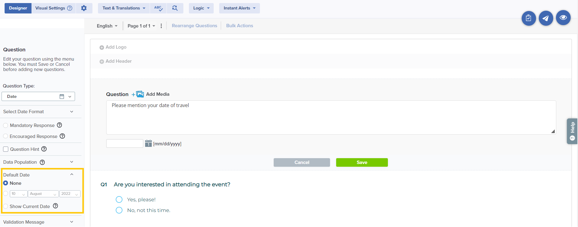 When setting up this question, you may choose your preferred display format, as well as a default date. Depending on the purpose of your question, you may choose to identify today’s date (the date of participation), to set a certain date many participants are likely to choose or to provide no default.