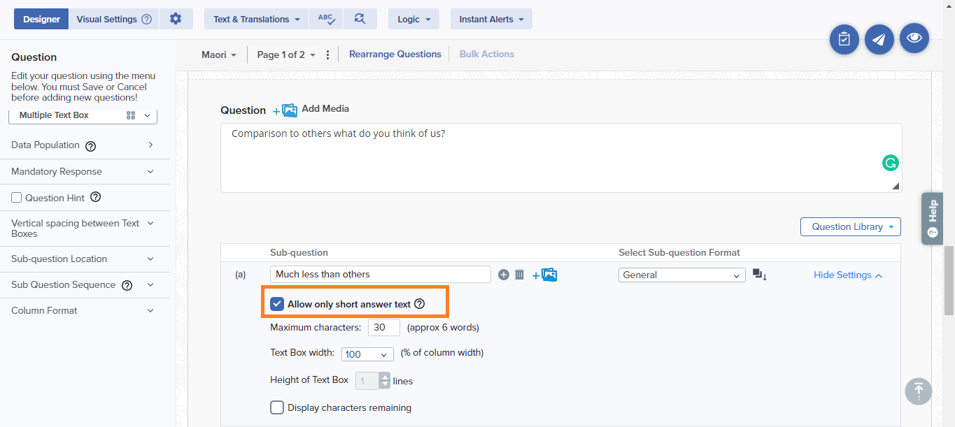 - This option is available for only Text Box – General format. Selecting this option means that participants will be able to provide only short text answers.