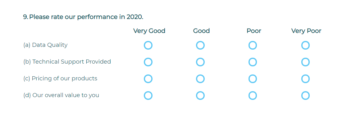 Radio Grid question presents participants with the same simple set of single-select Radio Button style answer options for each sub-question. As with Radio Button questions, this question type delivers frequency data in reports – in other words, how many times each answer was selected. Use this question type when the same answer set can be used for each sub-question and when the answers are each separate items rather than points on a scale.
