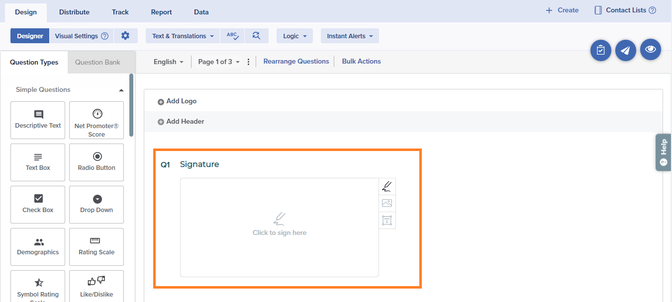 To add a Signature question to your survey, drag and drop the question type from the panel on the left to the correct spot on the right. If you prefer, double click the question icon to add the question type to the bottom of the current page.