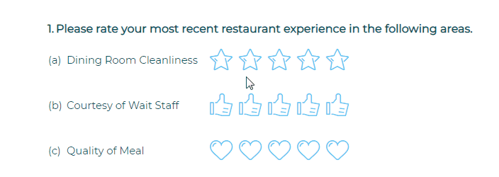 The Symbol Rating Scale, sometimes called the Star Rating Scale, is a visual version of the Rating Scale question. For each item, participants are asked to show their intensity of feeling using a symbol-based scale (Ex: 2 out of 5 stars).