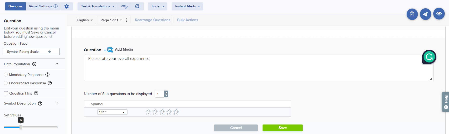 To add a Symbol Rating Scale question to your survey, drag and drop the question type from the panel on the left to the correct spot on the right.
