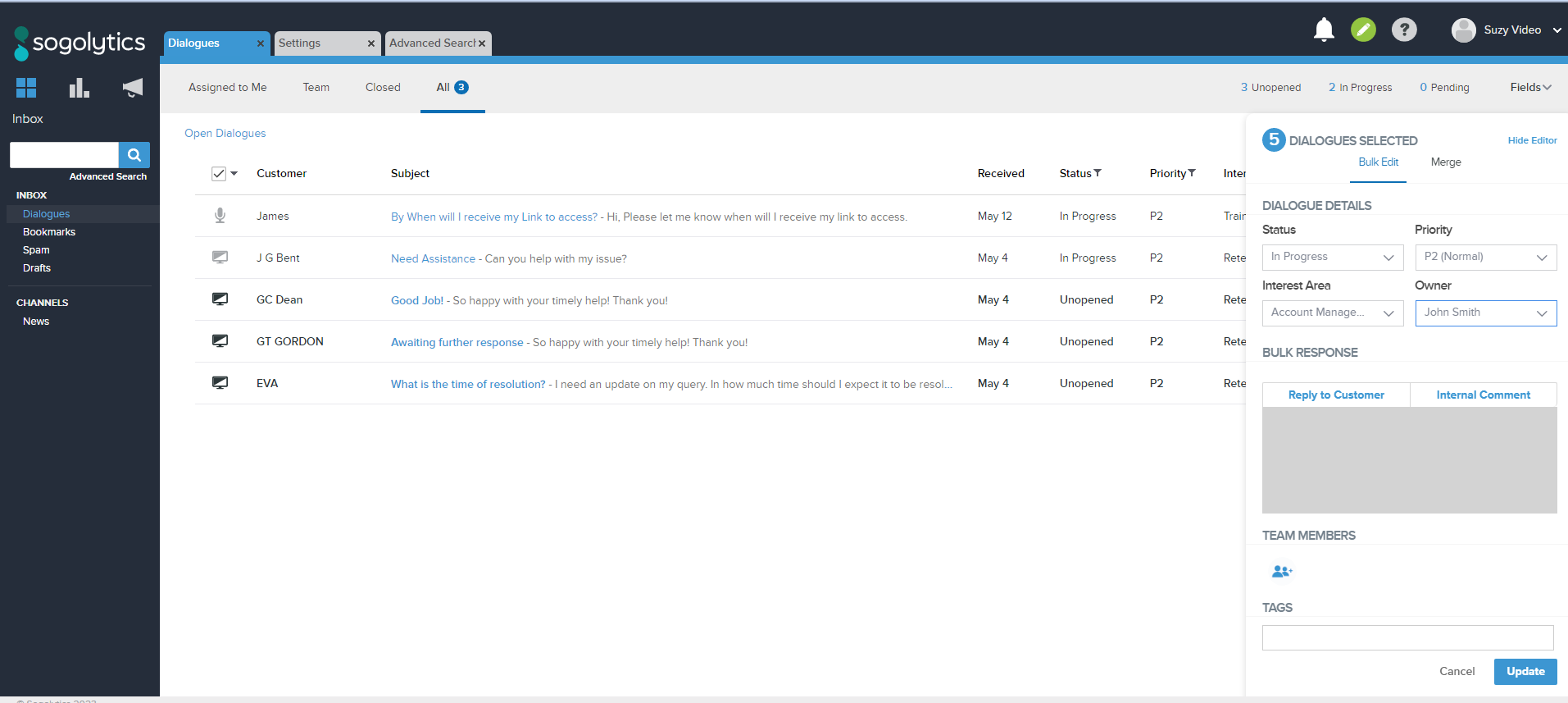 In Bulk Actions, you can Reply or Comment on all of the messages you selected. You can also set them all to have the same Dialogue Status, Priority, Interest Area(s), and Owner. Along with that, you can assign Team Members or add relevant Tags to the Dialogues you’ve selected.