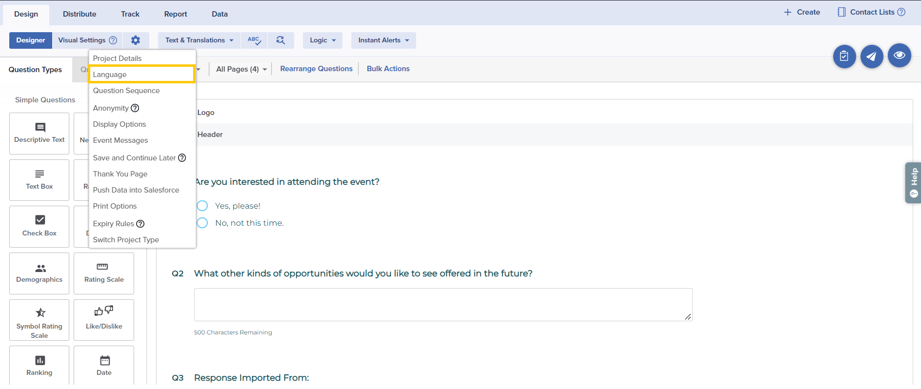 You can add multiple language for your participants to choose from or build your entire survey in a single language. Below, you’ll find a list of available Primary and Secondary Languages.