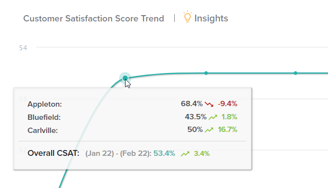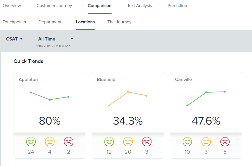 When the results start to come in, the team filters CSAT results by location in the CX Dashboard Overview tab.