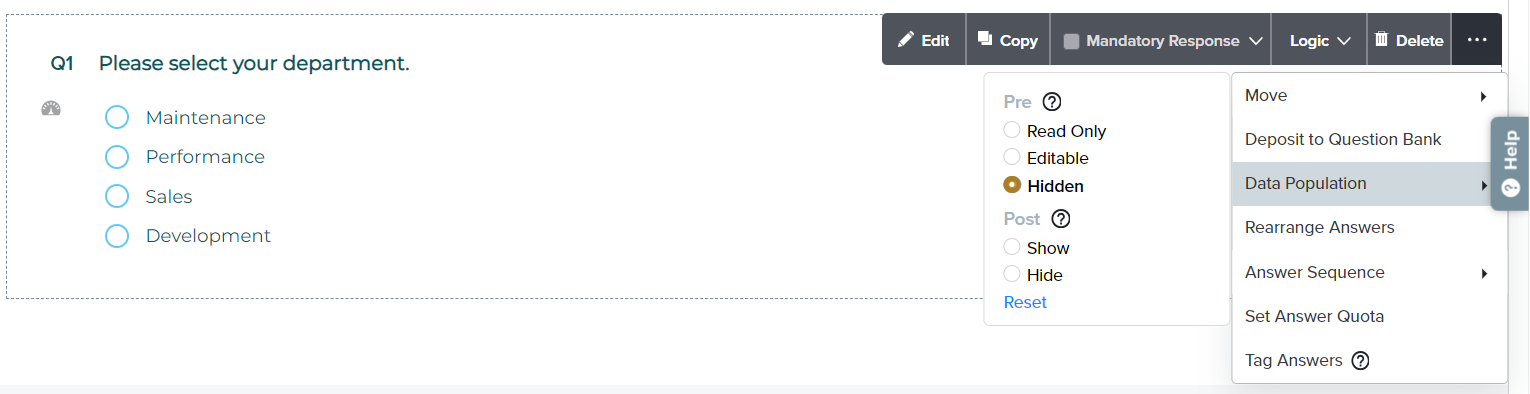 - Add a question that you’ll be able to use to differentiate responses, like location, department, or product type. (Remember that this might be a question you have to ask directly, but it could also be a question you can answer for your employee with Pre-Population!)