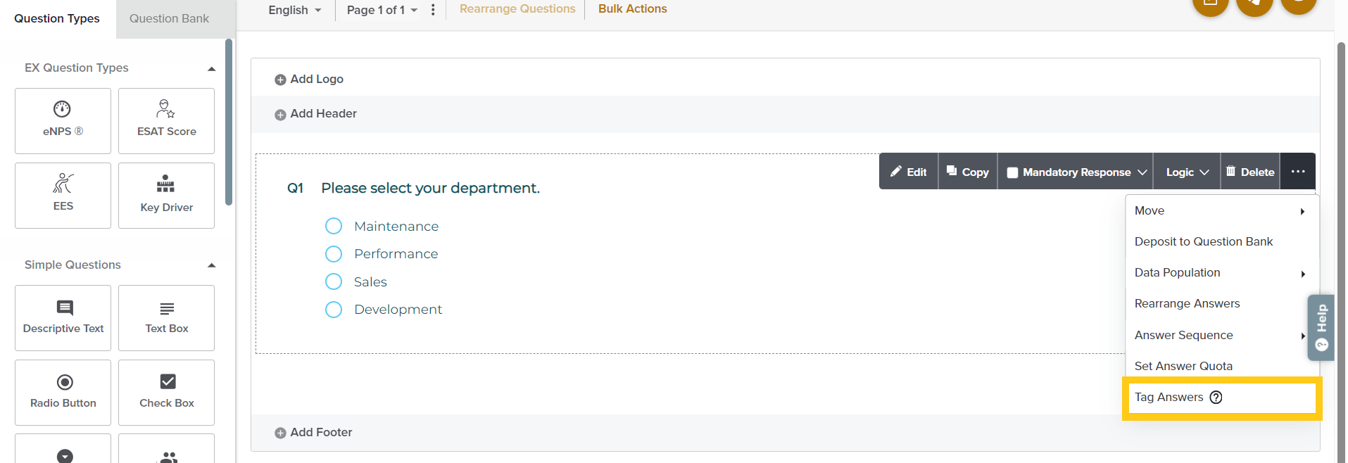You can add response-level Tag to answers in Radio Button, Check Box, Drop Down, and List Box question types.