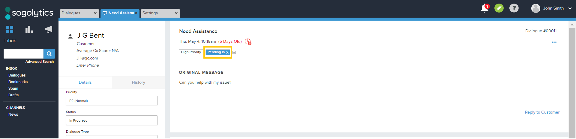 Similar to labels in email platforms, SogoConnect gives users the ability to add Tags to their Dialogues. Tagging Dialogues will help you to categorize messages and identify trends across Interest Areas, Customer groups, and time periods.