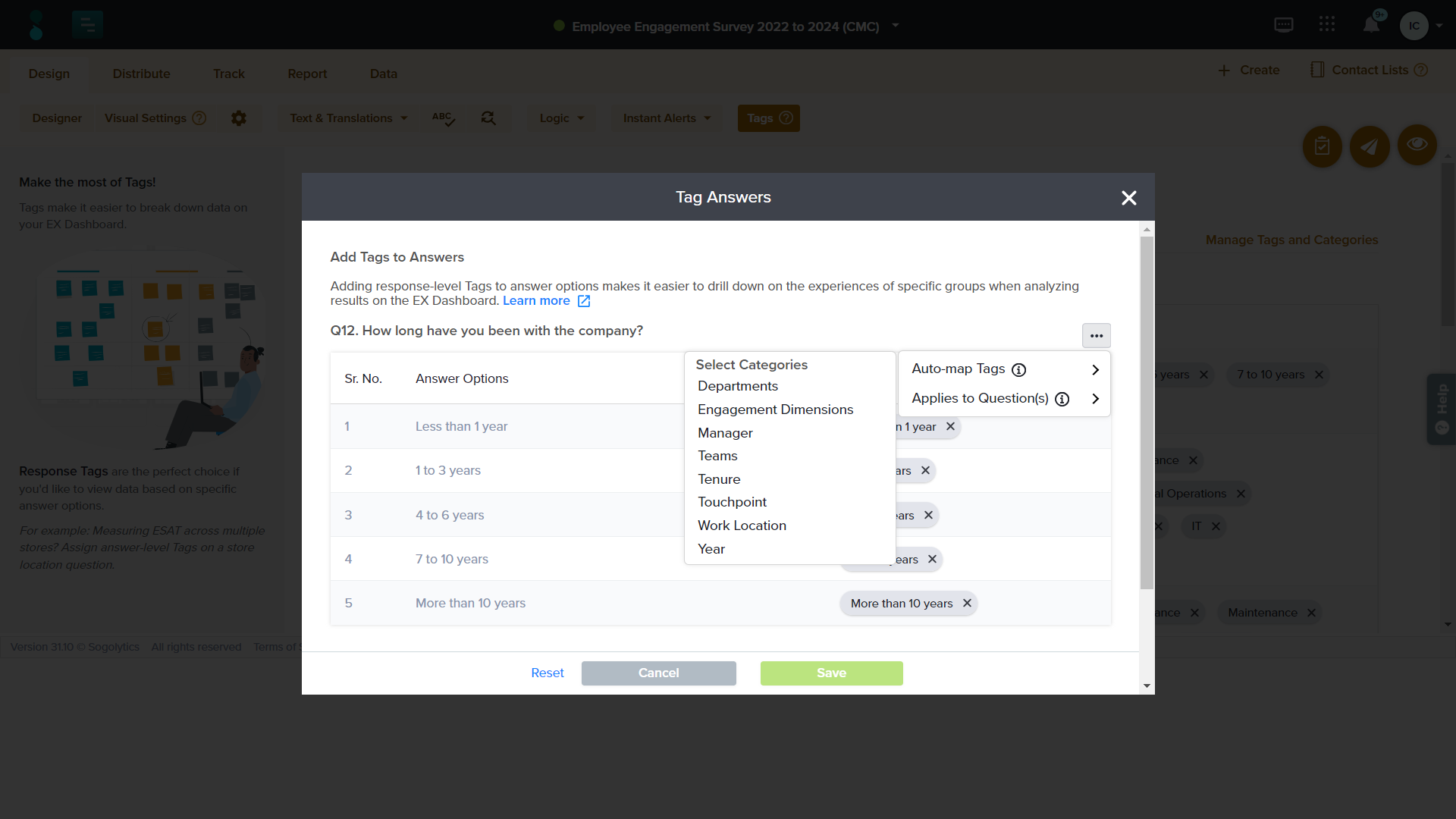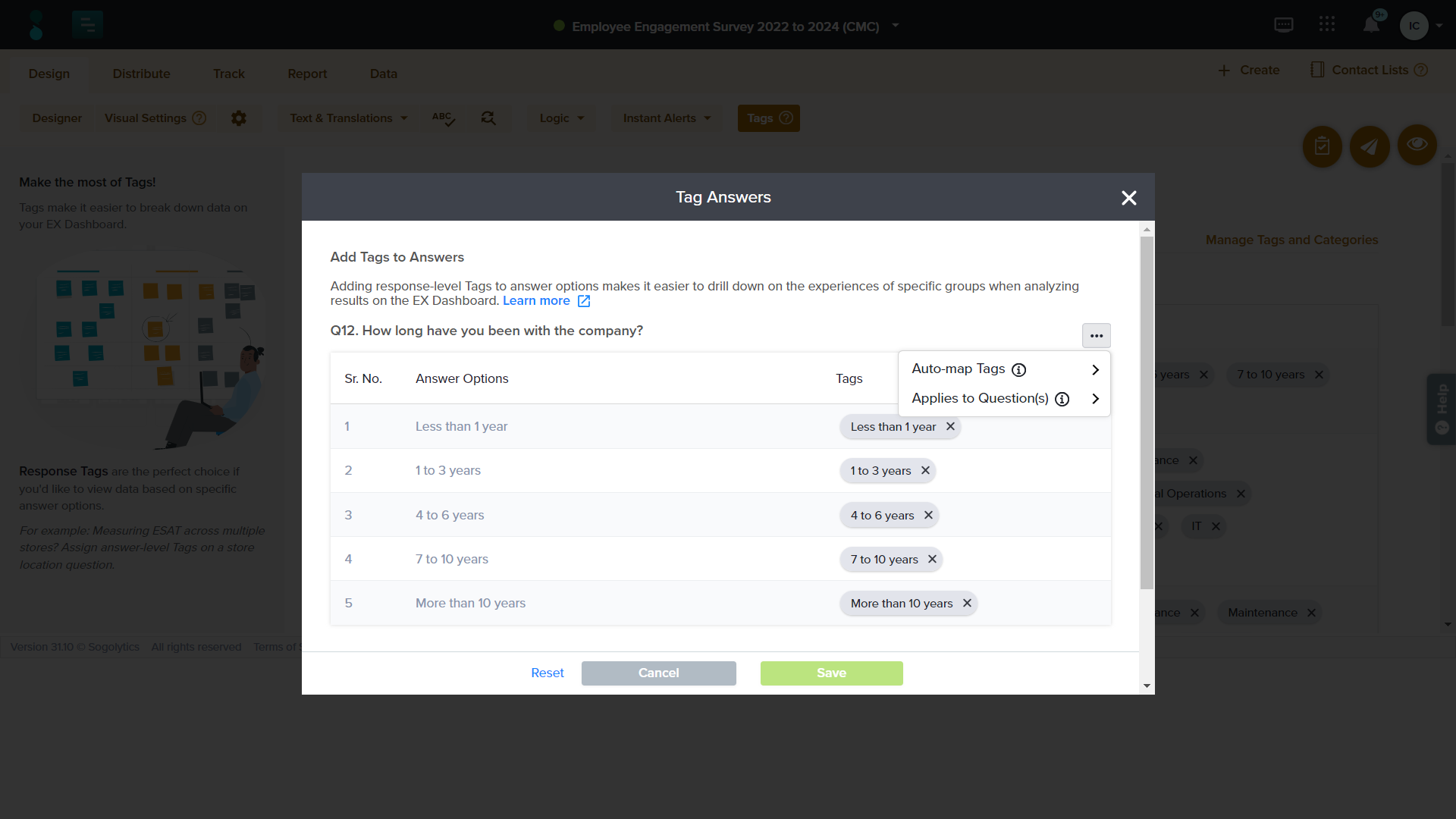 - If the answer options match the Tags in any Tag category, use the auto-map option available under the three dots icon to automatically match answers with the respective Tags.