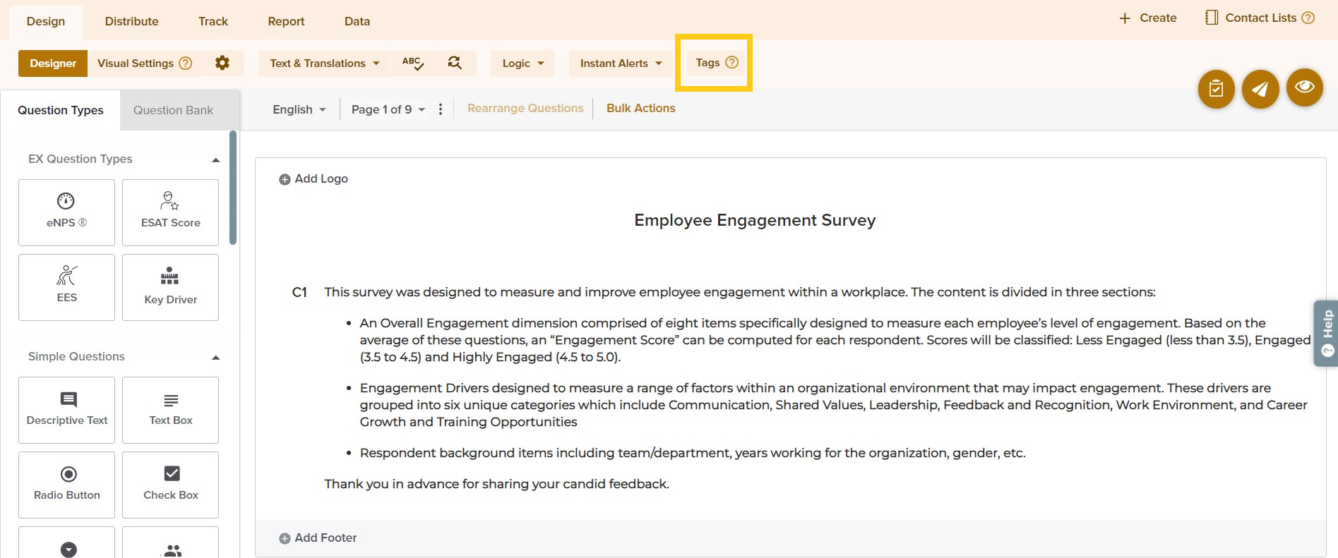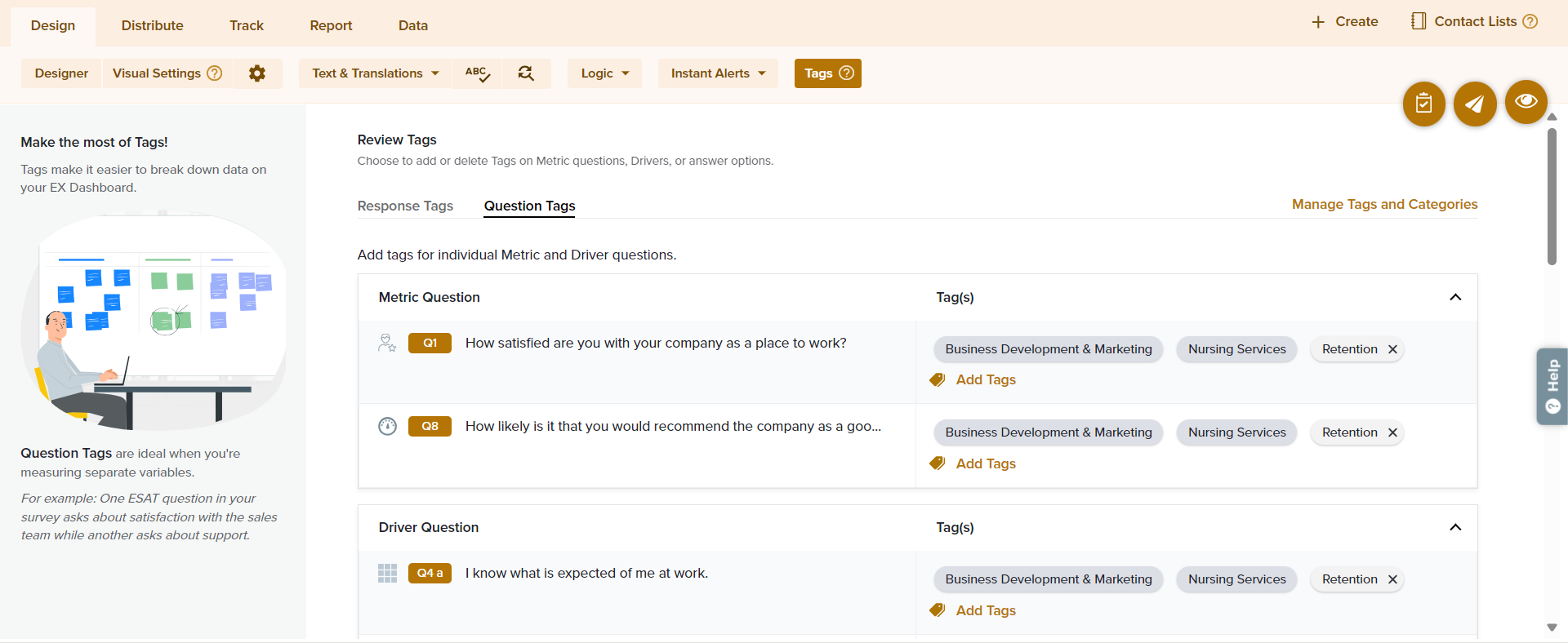 - Under Question Tags, you’ll see all of the survey’s metric and driver questions.