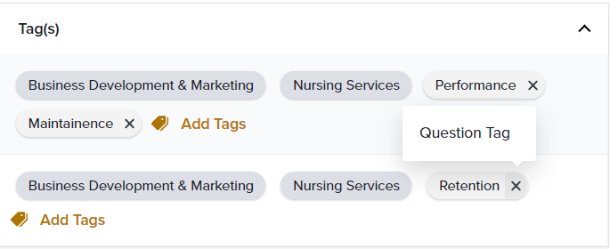 - Question-Level Tags: Use a question-level Tag when you’d like to measure the results of a specific question on your EX Dashboard.For example: