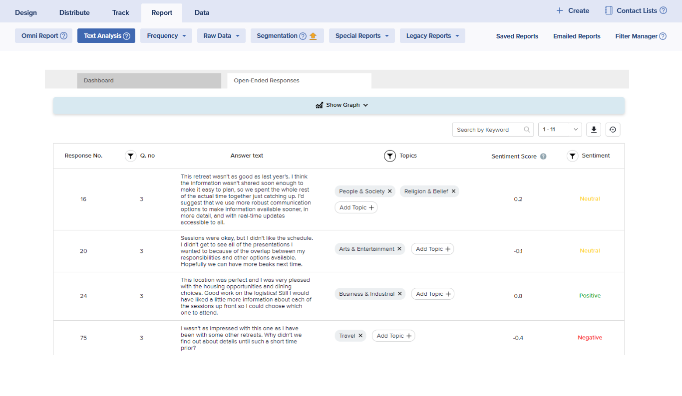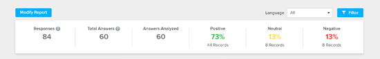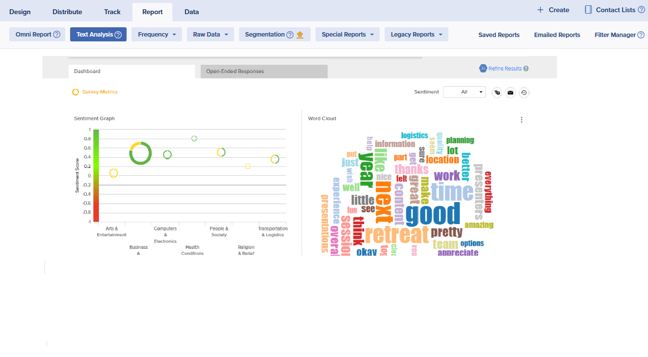 Reviewing every single open-ended response offers plenty of informative insights, but it can also be very time consuming. If you have a large number of responses and want to get a faster look at some common points and sentiments, Text Analysis can help.