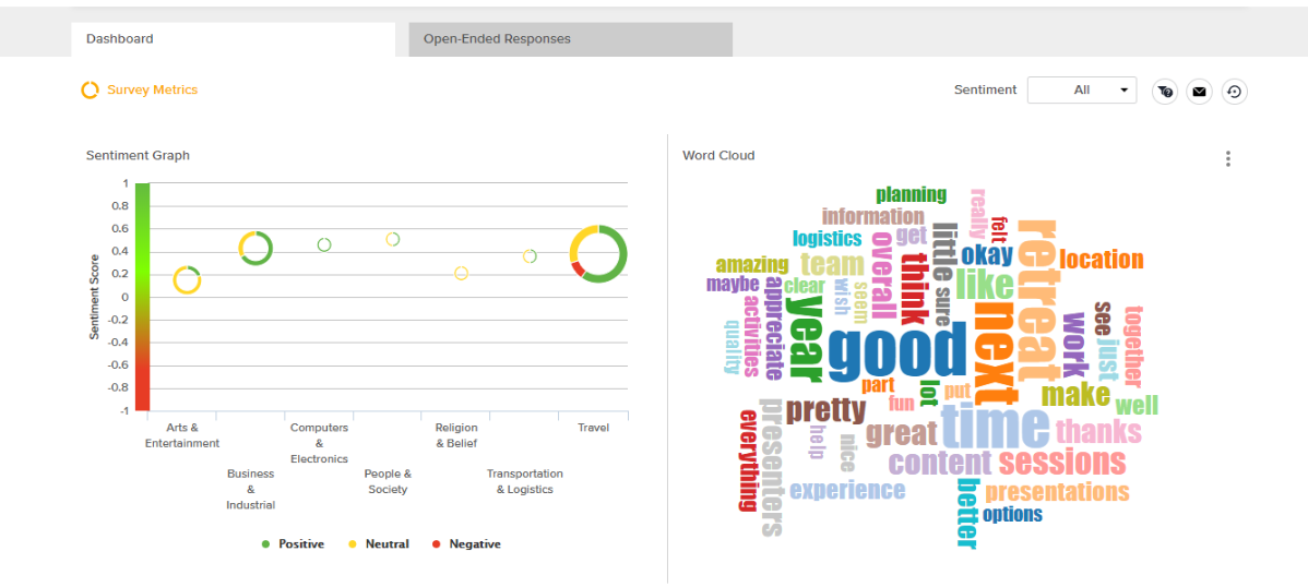 • To review responses by question or by sentiment, make selections from the top right of the Dashboard.